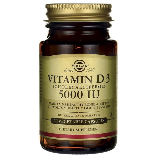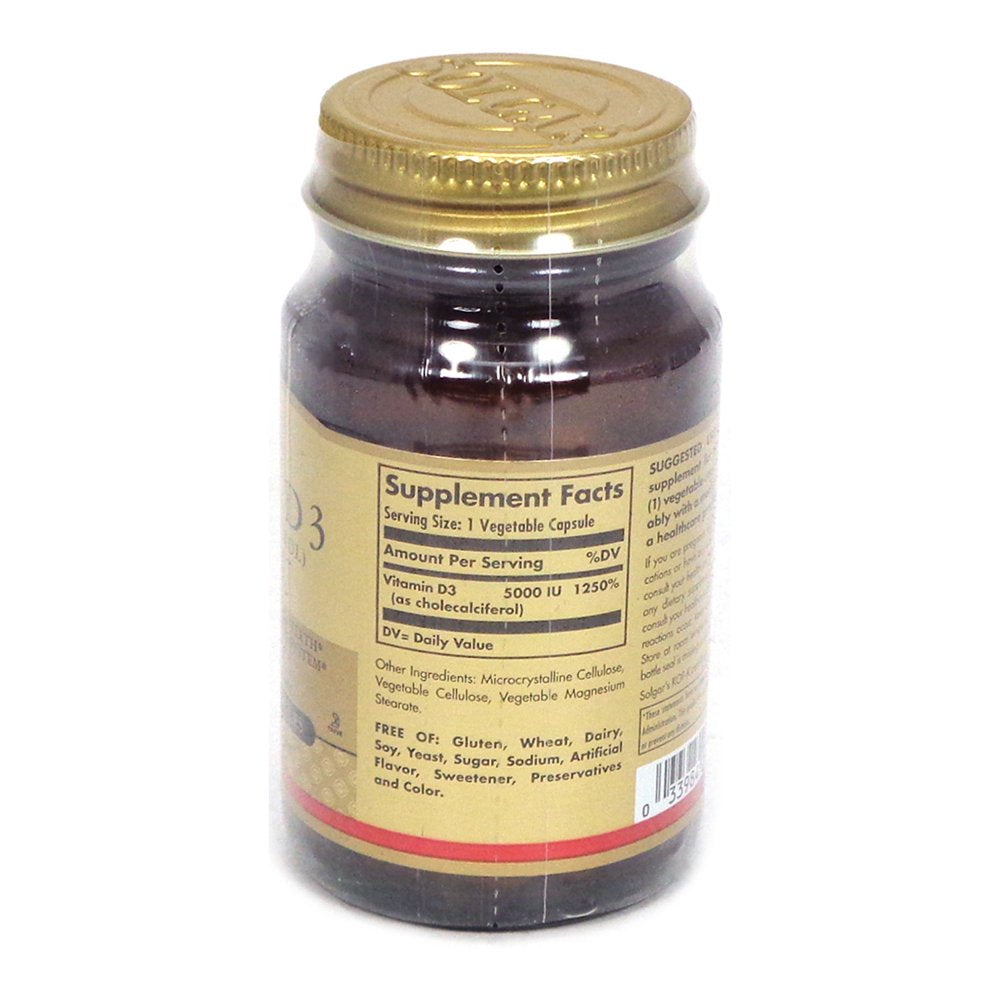 Solgar Vitamin D3 (Cholecalciferol) supports healthy bones and promotes the immune system. D3 assists the body with calcium absorption. D3 also supports the immune system and breast, colon and pancreas health. One of the primary natural sources of Vitamin D is the sun, so supplementation can be essential during winter, in northern climates, and during summer if you use sunscreen. Vitamin D absorption declines with age. Solgar's Vitamin D3 5000 IU vegetable capsules are free of gluten, wheat, dairy, soy, yeast, sugar, sodium, artificial flavor, sweetener, preservatives and color.