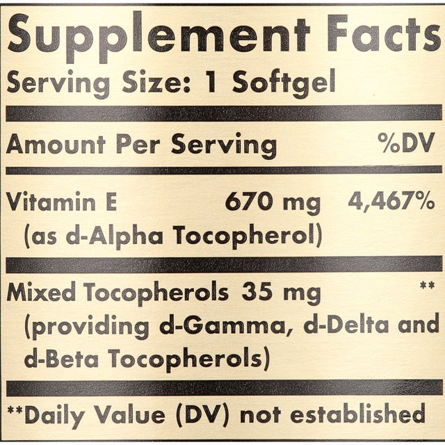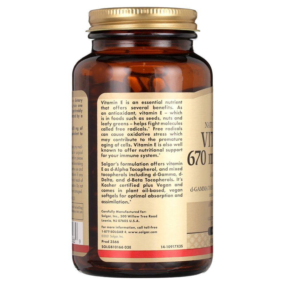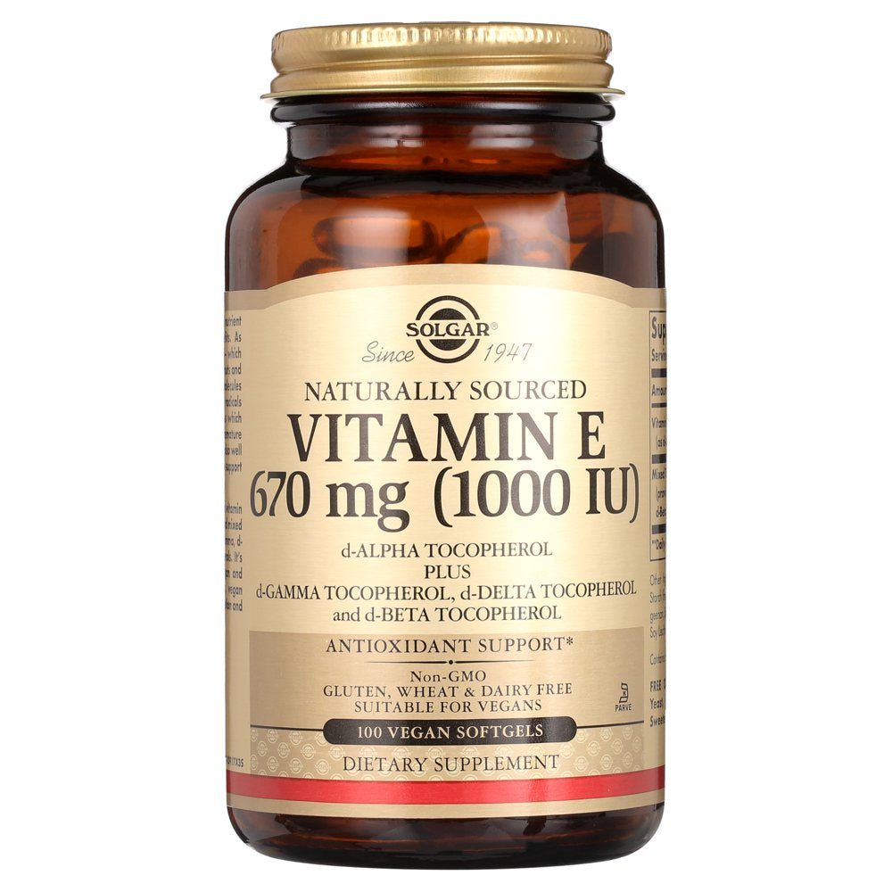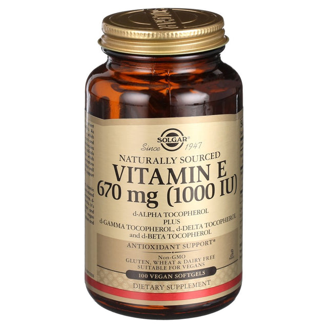 Natural Vitamin E 1000 IU - Mixed, Vegetarian 100 SoftgelProduct DescriptionNatural Vitamin E is an essential nutrient and is the body's primary, fat-soluble antioxidant. Vitamin E provides nutritional support for the cardiovascular system, skin, and the immune system. It helps fight cell-damaging free radicals that cause oxidative stress in the body, which may contribute to the premature aging of cells. This formulation provides natural Vitamin E as d-Alpha Tocopherol plus d-Beta, d-Delta, and d-Gamma Tocopherols . It is offered in plant oil-based, vegetarian softgels to promote optimal absorption and assimilation.Suggested Use As a dietary supplement adults, take one 1 vegetarian softgel daily, preferably with a meal - Or as directed by your healthcare professional.Supplement FactsServing Size 1 Softgel Servings Per Container 100 Amount Per Serving% Daily Value***Calories 5 Vitamin E as d-Alpha Tocopherol plus d-Beta, d-Delta and d-Gamma Tocopherols 1000 IU 3333% ***Percent Daily Values are based on a 2,000 calorie dietOther Ingredients Modified Starch from corn , Vegetable Glycerin, Carrageenan, Safflower Oil, Disodium Phosphate, Medium Chain Triglycerides, Soy Lecithin.Does Not Contain Gluten, Wheat, Dairy, Yeast, Sugar, Artificial Flavor, Sweetener, Preservatives and Color.Warnings Keep out of reach of children. As with all dietary supplements, consult your healthcare professional before use. See product label for more information.