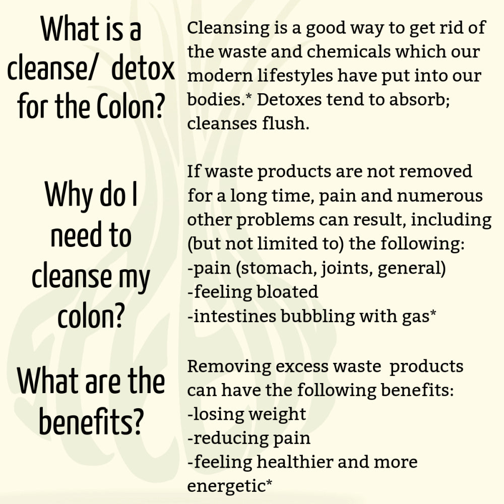 - WHAT IS COLON CLEANSING & DETOX? Colon cleansing is a good way to get rid of the waste & chemicals which our modern lifestyles have put into our bodies.* Detoxes absorb, Cleanses flush*