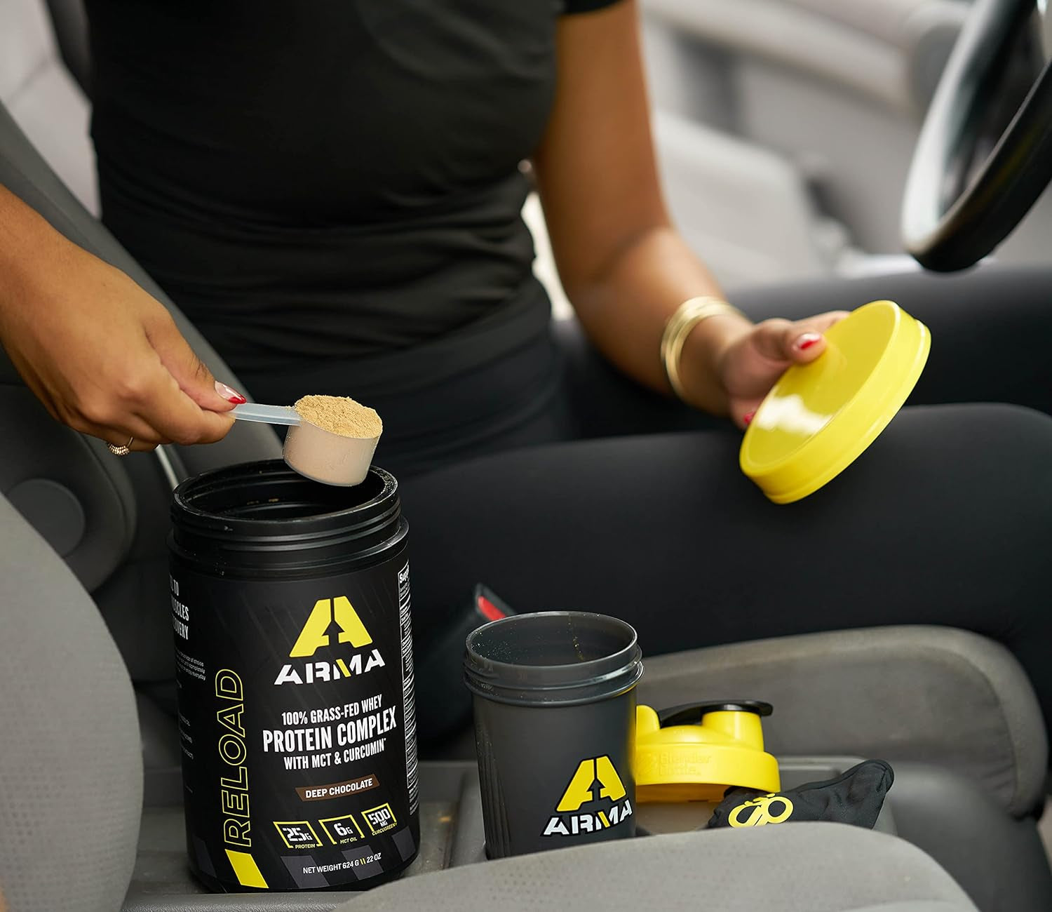 Professional, effective protein.Our specialized formula utilizes Curcugreen Curcumin and BioPerine extracts to rapidly deliver anti-inflammatories and antioxidants for post-workout recovery or daily protein supplement. To ensure that our products are safe for top athletes we test each single batch to ensure that there are no unethical ingredients that may harm your performance. Be confident that ARMA was made to compete at the highest level! | Great taste, amazing formula.ARMA Reload is packed with 25g of cold-pressed grass-fed Whey Protein Isolate (WPI) and Whey Protein Concentrate (WPC) per serving to create a low-lactose, high-quality, extended absorption protein complex. We’ve added MCT, the super-fuel for your body, making ARMA Reload your complete protein complex perfect for everyday use to lose weight, repair muscle, and keep adventuring. Hormone Free, No Antibiotics, Cold Pressed Whey, Whole Fruit Extract, Diabetic Safe, non-GMO, Preservative Free, Gluten Free. | Simple and easy to use.Depending on your routine, ARMA RELOAD can be used every morning, before workout or cardio, and post-workout. Simply use two scoops for a great tasting protein drink. Although you can mix our products into any liquid you choose, we recommend mixing all of ARMA’s products with water because it will deliver the greatest amount of our specially formulated ingredients at the maximum dose without any extra unnecessary calories from unwanted sugars, fats, and carbs. |