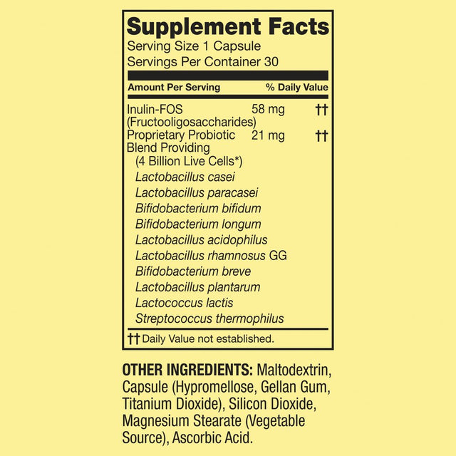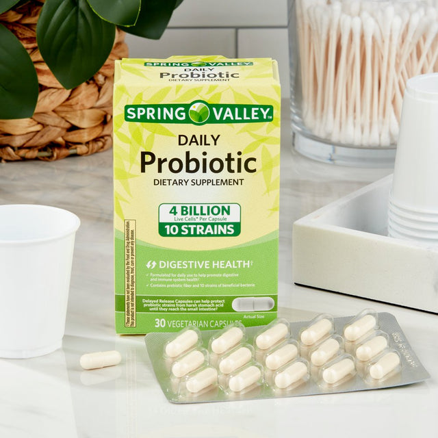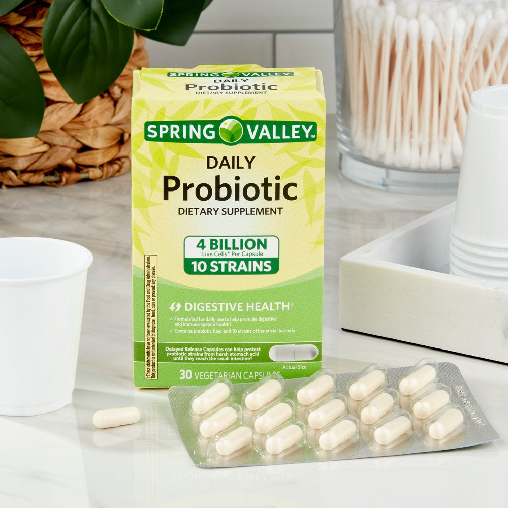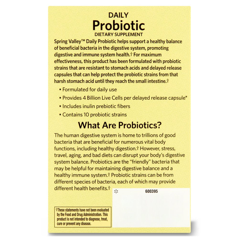 Spring Valley Daily Probiotic Unflavored Delayed-Release 30 Capsules help support a healthy balance of beneficial bacteria in the digestive system, promoting digestive and immune system health. For maximum effectiveness, this product has been formulated with probiotic strains that are resistant to stomach acids and delayed-release capsules that can help protect the probiotic strains from that harsh stomach acid until they reach the small intestine. Protect your digestive health with Spring Valley Daily Probiotic Delayed-Release Capsules.