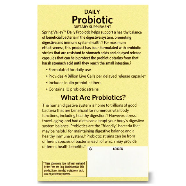 WHAT ARE PROBIOTICS? The human digestive system is home to trillions of good bacteria that are beneficial for numerous vital body functions, including healthy digestion. However, stress, travel, aging, and bad diets can disrupt your body's digestive system balance. Probiotics are the "friendly" bacteria that may be helpful for maintaining digestive balance and a healthy immune system. Probiotic strains can be from different species of bacteria, each of which may provide different health benefits. Supplement your healthy lifestyle with our Spring Valley Daily Probiotic.