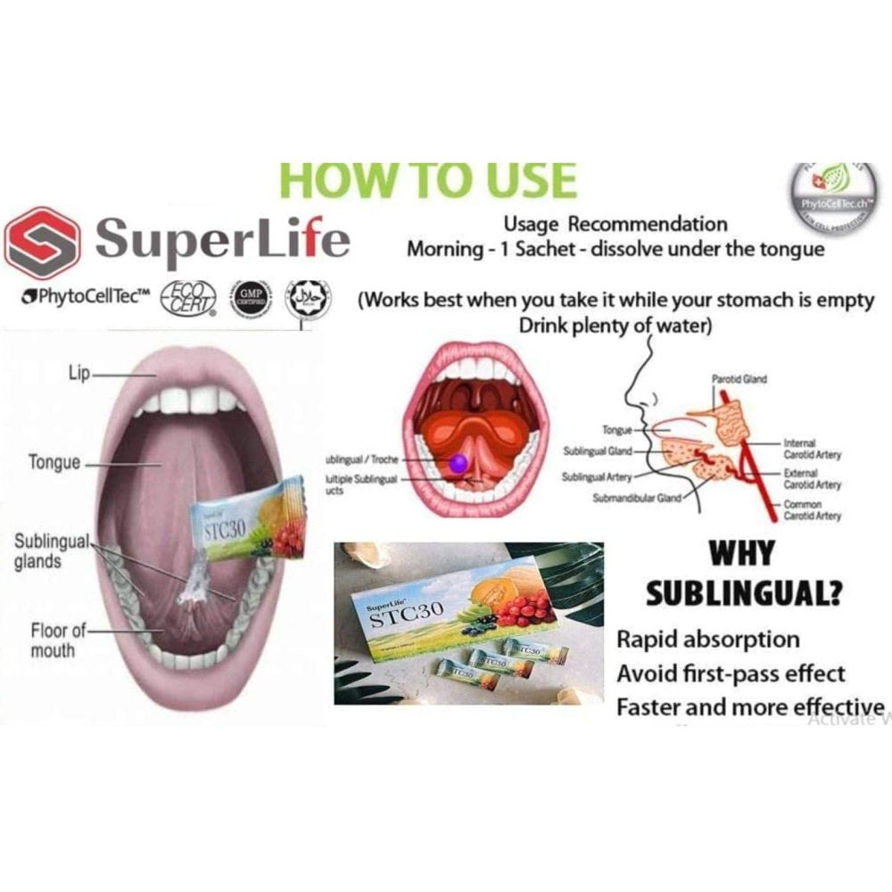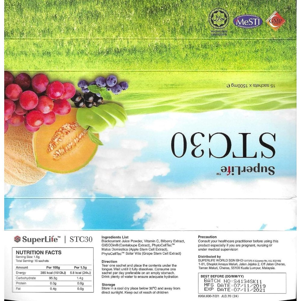 Superlife Stc30 is a natural dietary health supplement that is taken sublingually i.e. applied under the tongue (enabling 95% of its nutrients to be immediately absorbed). It is a plant-based food therapy. It is sold by leading Superlife world in Malysia Anti-Aging & Regenerative Clinics and GMP facilities. Superlife Product is approved by several international bodies around the world international bodies and approved in over 45 countries.Superlife Stc30 activates your own adult stem cells naturally and provides robust immunity. With 50 to 70 trillion cells in our body, cellular health is crucial to our overall well being and good health.Each pack contains a 15days supply which is 15sachet.A month supply will be 2 boxes of stc30.The recommended dosage is one sachet a day and at least 1 month dosage