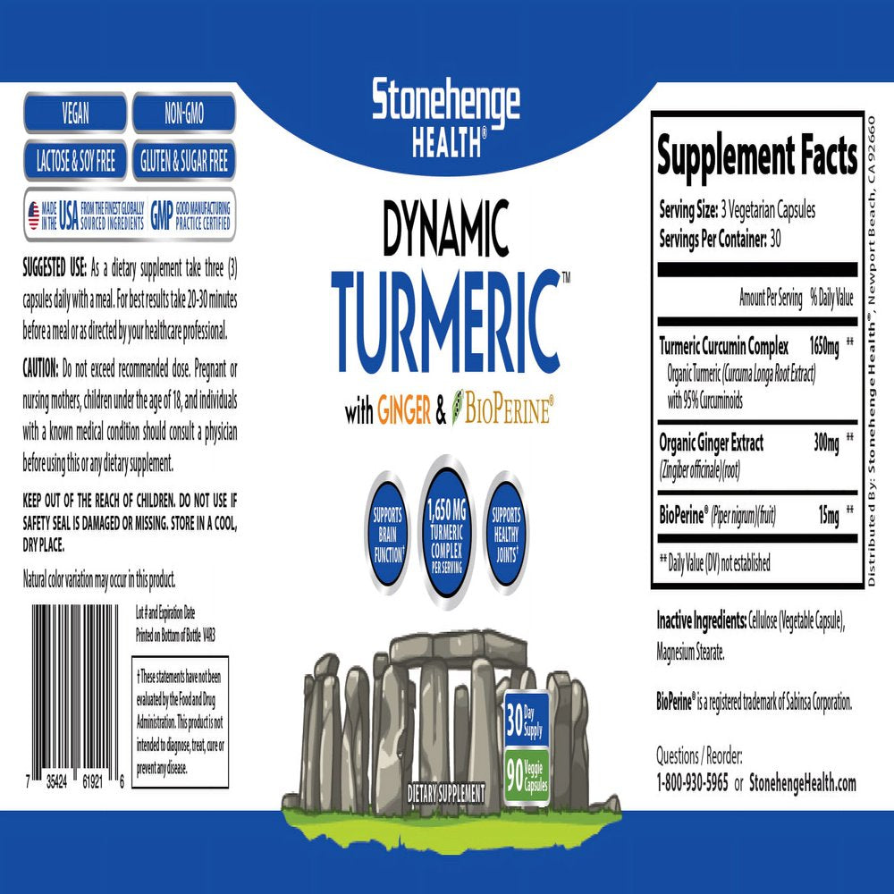 Stonehenge Health Dynamic Turmeric with Ginger and BioPerine® is a natural choice. For maximum results in each recommended daily dose, we have included 1,650 mg of Turmeric Curcumin Complex using Organic Turmeric and standardized 95% curcuminoids, plus 15mg of BioPerine® for added absorption, and 300 mg of Organic Ginger Extract. Each bottle contains 90 Vegetarian Capsules for a 30 days supply