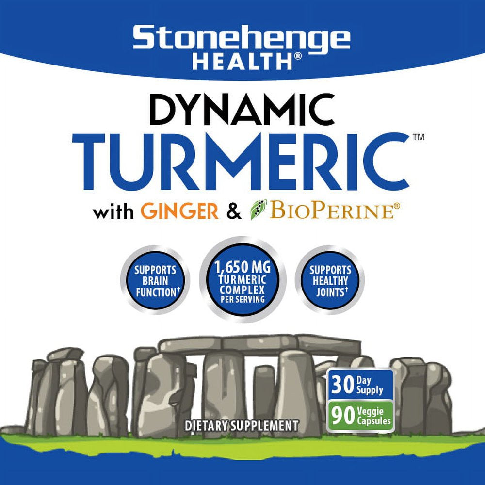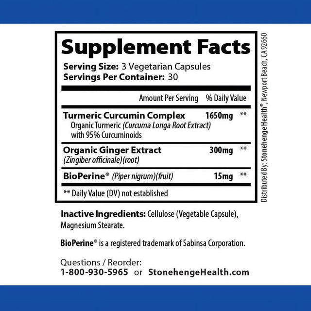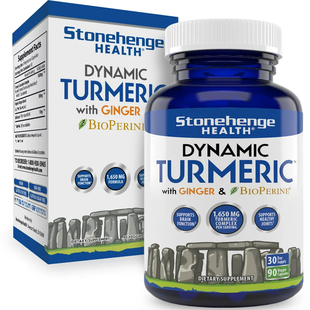 | Product Name | Stonehenge Health Dynamic Turmeric Curcumin Ginger Highest Potency Available. 1,650 mg Turmeric with 95% Curcuminoids & BioPerine®. Supports Joint Health, 90 Vegetarian Capsules (1 Pack) |