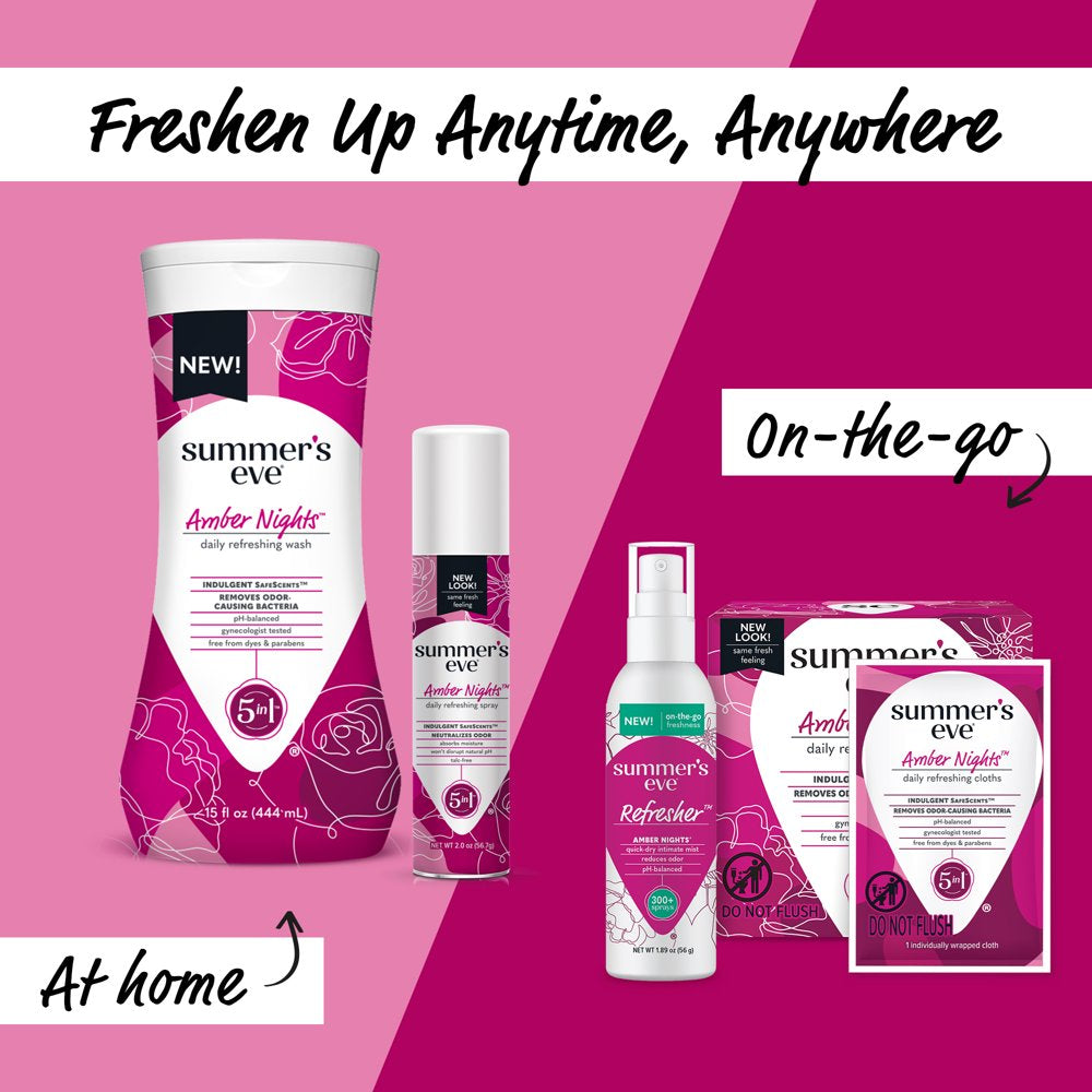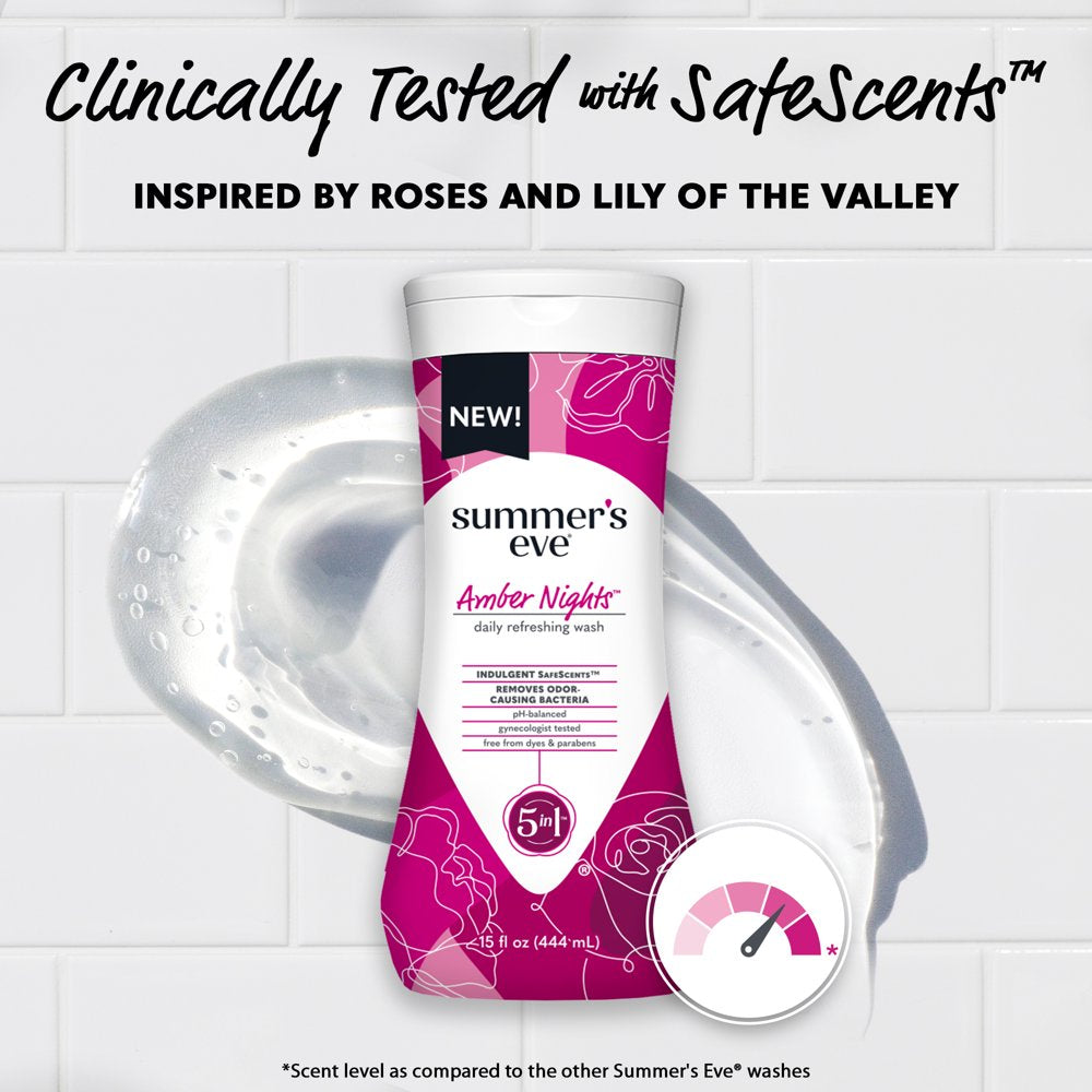 - Summer's Eve Amber Nights Daily Refreshing Feminine Wash removes odor-causing bacteria and is formulated with Oat and Shea Extracts