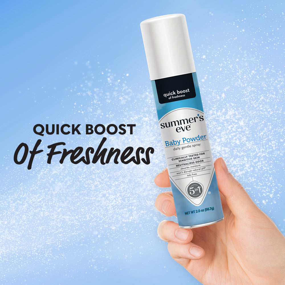 - Contains 1 bottle of Summer's Eve Baby Powder feminine spray 2 oz
