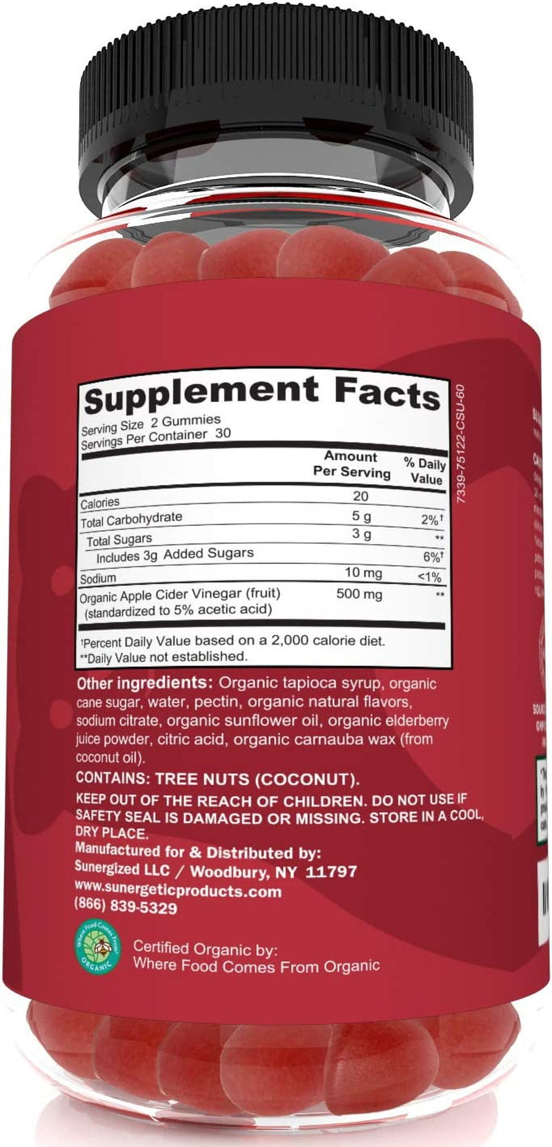 - CERTIFIED ORGANIC APPLE CIDER VINEGAR: There are many brands that use non-organic apple cider vinegar or claim their ACV gummies are made with organic apple cider vinegar. However, Sunergetic’s Apple Cider Vinegar formula is actually Certified Organic with a verified seal. Try our tasty organic apple cider vinegar gummies with the mother to experience the power of Organic Apple Cider Vinegar today!