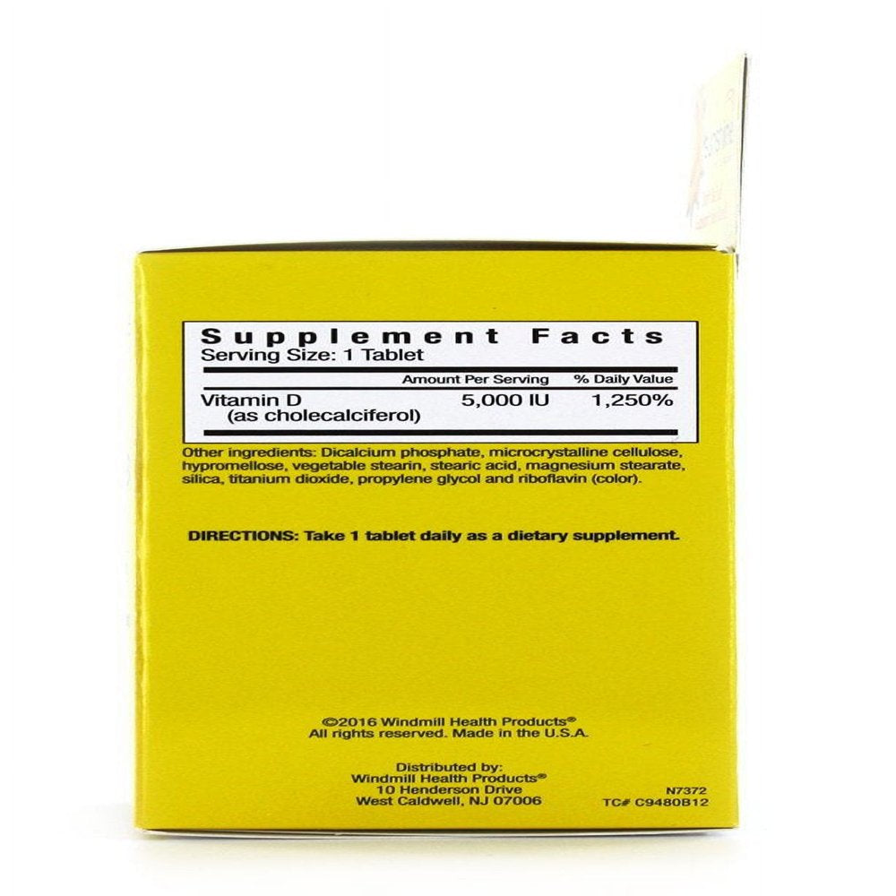 Windmill Sunshine Super Vitamin D 5000Iu Tablets To Support Your Mood - 30 Ea - Provides you with 5,000 IU of cholecalciferol and 100 mg of vitamin C per caplet. Cholecalciferol, otherwise known as D3, is the vitamin D that is formed when the sun touches human skin.