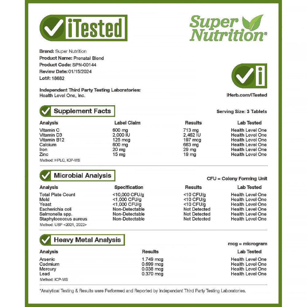 Super Nutrition® Prenatal Blend contains an essential blend of both vitamins and minerals that were chosen specifically for their nutritional support of expectant and new mothers.* You’ll get a potent dose of vitamins B12, C, D, and E, as well as biotin. This formula also contains folate and choline, two nutrients important for pregnant women. Folate is a B vitamin thought to help support healthy development of the baby’s brain and spine.* When taken during pregnancy, choline can also help support a healthy baby*. High Potency Vitamin and Mineral Blend for Expectant and New Mothers* Featuring Folate and Choline Supports Prenatal and Postnatal Health* iTested Verified