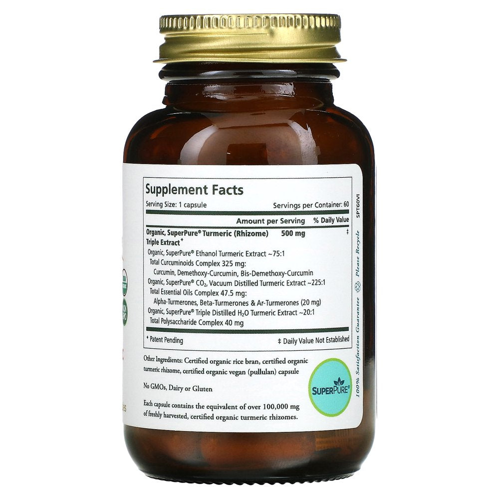 USDA Organic Non GMO Organic Extract Dietary Supplement No GMOs, Dairy or Gluten SuperPure® Certified Organic by Oregon Tilth Certified Kosher Certified B Organic Golden Healer Our breakthrough, exclusive organic turmeric triple extract has all the power of its potent curcuminoids, essential oil and polysaccharides for superior absorption and its impressive health benefits. Feel the difference with SuperPure® Turmeric.