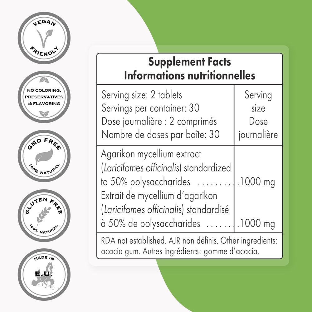 A pioneer in dietary and nutritional supplements for over 30 years. Supersmart Agarikon is an immunity-boosting mushroom, referred to as the "elixir of long life" in ancient Greece. This supplement is a high-quality extract of agarikon mushroom (also known as white agaric or larch polypore) for men and women. It is made with the mycelium of agarikon, more digestible and bioavailable than other parts of the mushroom. It supports the immune and respiratory systems, and is standardized to 50% polysaccharides for maximum efficacy. Traditionally, it has been used in popular apothecary for thousands of years. It is served in the form of a tablet, vegetarian friendly, ensuring a maximized effectiveness for a healthy life for all. You can enjoy this mushroom supplement capsules at Supersmart.Our products and formulas are constantly updated to reflect the latest scientific research, advances, and production methods. We offer an outstanding quality and choice of Gluten Free, Non-GMO, Additive Free, Soy Free, Nano Particules Free and Vegan Friendly products.