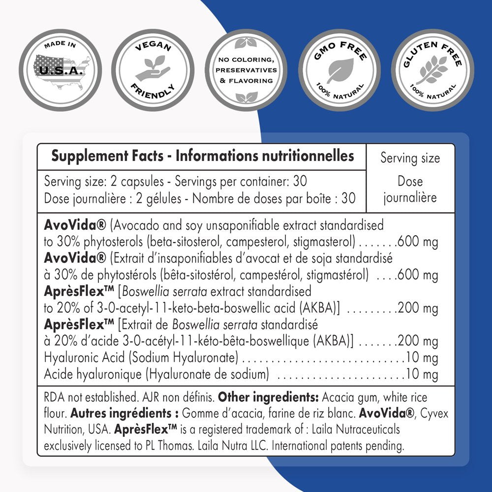 - ENHANCED FORMULA - Contains 30% phytosterols (beta-sitosterol, campesterol, stigmasterol), 20% AKBA, Hyaluronic acid.