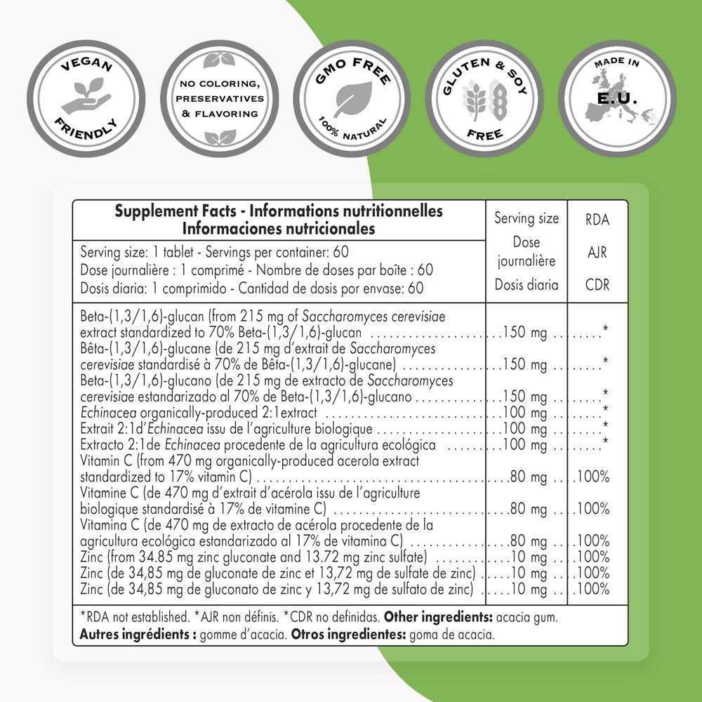 Extract 2:1 of Echinacea purpurea from organic farming, Beta-(1,3/1,6)-glucan (from 215 mg Saccharomyces cerevisiae extract standardized to 70% beta-(1,3/1,6)-glucan), Vitamin C (from 470 mg acerola extract from organic farming standardized to 17% vitamin C), Zinc (from 34.85 mg zinc gluconate and 13.72 mg zinc sulphate) | Other ingredient: acacia gum/div>
