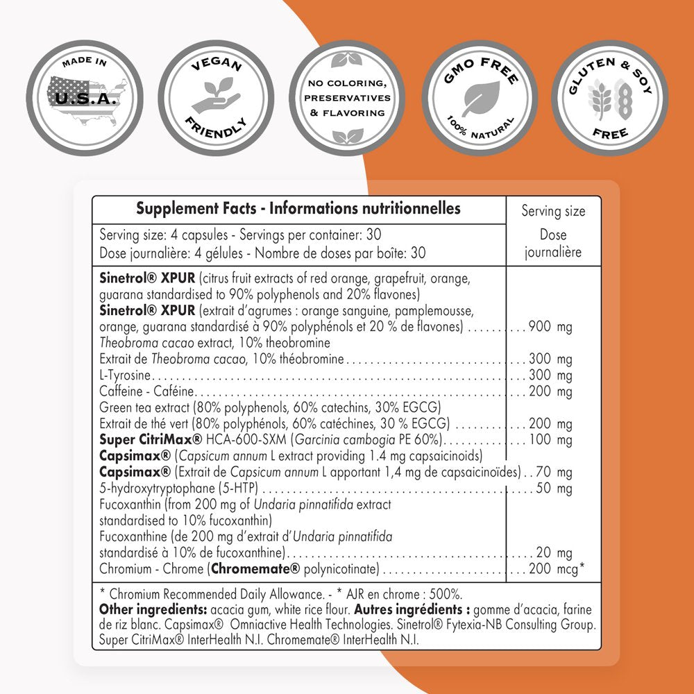 Sinetrol® -XPUR (citrus extract: blood orange, grapefruit, orange, guarana standardized to 90 % polyphenols and 20% flavones), Theobrama cacao extract, 6 % theobromine, L-Tyrosine, Caffeine, Green tea extract (80 % polyphenols, 60 % catechins, 30 % EGCG), Super CitriMax® HCA-600-SXM (Garcinia cambogia PE 60 %), Capsimax® (Capsicum annum L extract providing 1.4 mg of capsaicinoids), 5-hydroxy tryptophan (5-HTP), Fucoxanthin (from 200 mg Undaria pinnatifida extract standardised to 10 % fucoxanthin), Chromium (Chromemate® polynicotinate) | Other ingredients: Acacia Gum, Rice Flour | Capsimax® Omniactive Health Technologies - Sinetrol® Fytexia-NB Consulting Group - Super CitriMax® InterHealth N.I. Chromemate® InterHealth N.I./div>