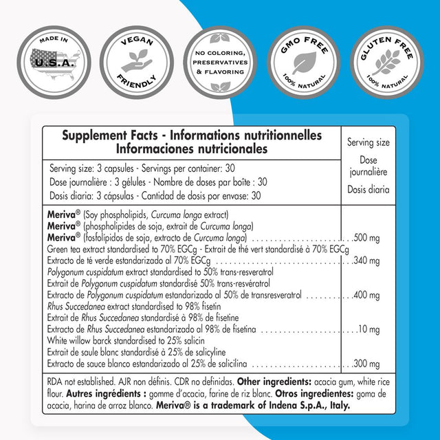 - ENHANCED FORMULA - Contains 70% EGCg (Green tea), 50% trans-resveratrol, 98% fisetin, 25% salicin (white willow bark), and Meriva curcuma.