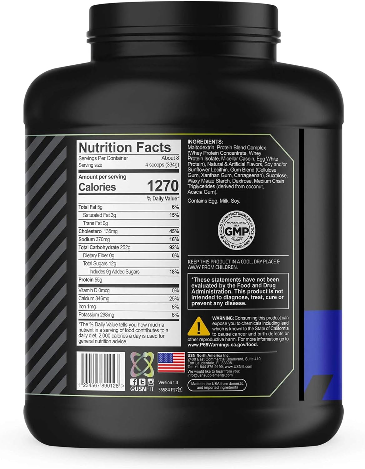 USN Anabolic Mass Gainer is packed with premium protein, carbs, and calories for big gains. Key Features: - 55g Protein per serving - 249-252g Carbs per serving - 1270 Calories per serving Benefits: - Anabolic Mass Gainer provides a mega dose of essential nutrients to pack on lean muscle. - Each calorie-dense serving supports weight gaining goals. How to use: - Add 4 scoops (334g) of Anabolic Mass Gainer to a blender or large shaker cup filled with 17-20oz (500-600ml) of water. - Blend or shake until well mixed.