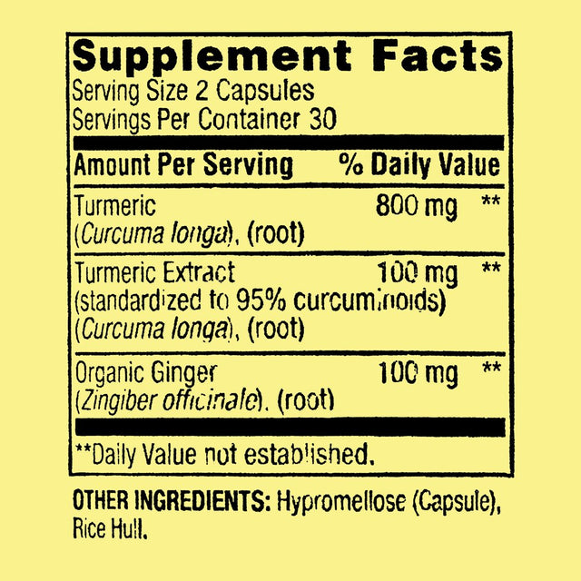 Turmeric Root Extract (Curcuma Longa) (Root) (Std. To 95% Curcuminoids) 800 mgGinger Root Extract (Zingiber Officinale) (Root) 100 mgOther Ingredients: Hypromellose (Capsule), Rice Flour, Magnesium Stearate, Silicon Dioxide./div>