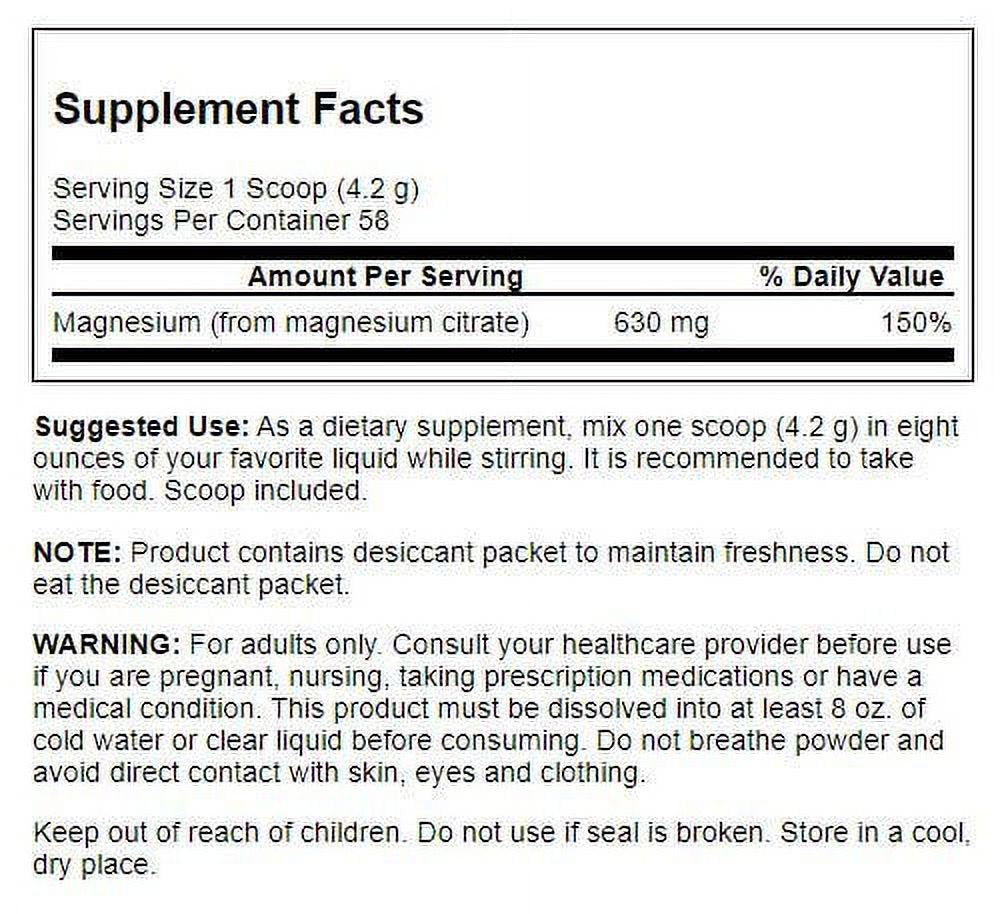Magnesium 630 mg 150%,As a dietary supplement, mix one scoop (4.2 g) in eight ounces of your favorite liquid. It is recommended to take with food. Scoop included.,Consult your healthcare provider before use if you are pregnant, nursing, taking prescription medications or have a medical condition.,Product contains desiccant packet to maintain freshness. Do not eat the desiccant packet./div>