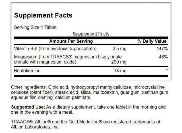 Thiamin (vitamin B-1) 12.5 mg 833%,Vitamin B-6 (as pyridoxal 5-phosphate) 2.5 mg 125%,Magnesium 200 mg 50%,Other ingredients: Magnesium oxide, microcrystalline cellulose (plant fiber), stearic acid, citric acid, guar gum, xanthan gum, magnesium stearate, maltodextrin, silica, aqueous film-coating (purified water, hydroxypropyl methylcellulose, vegetable glycerin).,As a dietary supplement, take one tablet in the morning and one in the evening with a meal.,TRAACS, Albion and the Gold/div>