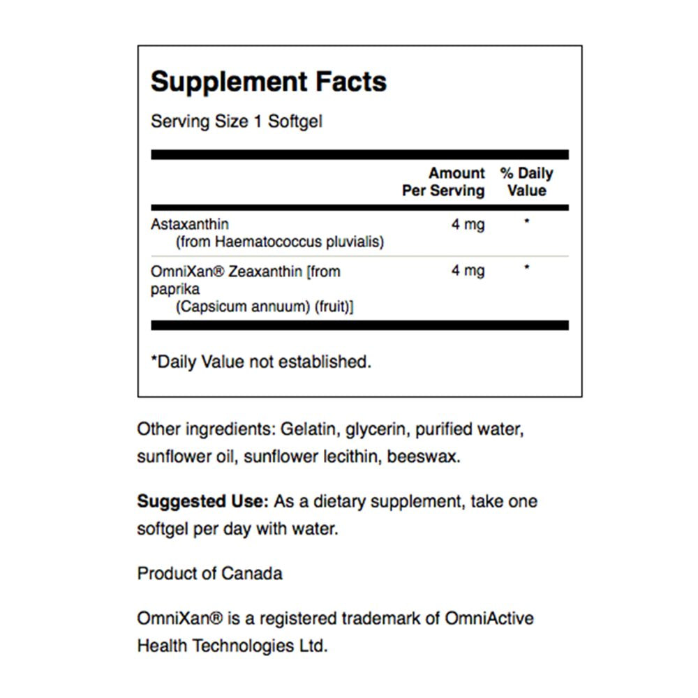- PROMOTES HEALTHY SKIN and RETINAS - With 4 mg of astaxanthin and 4 mg of OmniXan zeaxanthin per 1 softgel serving, Swanson Astaxanthin and Zeaxanthin delivers vital nutrition to help protect the health and function of the retina, the layer of nerve cells lining the back wall of your eyes, plus promote antioxidant activity in the body. These antioxidants team up to protect body and mind against oxidative stress, providing valuable free radical protection for skin, vital organs, tissues and more.