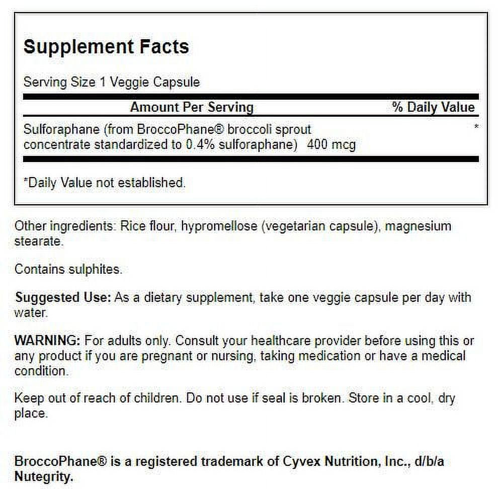 Sulforaphane 400 mcg *,Other ingredients: Rice flour, hypromellose (vegetable capsule), may contain one or both of the following: magnesium stearate, silica.,As a dietary supplement, take one capsule per day with water./div>