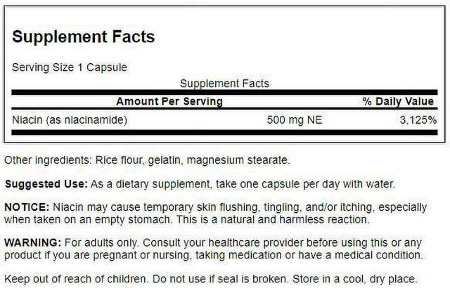 Unlike regular niacin, Swanson Niacinamide supports joint health and helps maintain blood sugar levels already within a normal range. It also doesn't cause the "niacin flush" associated with ordinary niacin supplements. But like niacin, this unique formula plays a vital role in carbohydrate metabolism, helping to supply the entire body with energy. Each capsule delivers 500 mg of niacinamide.