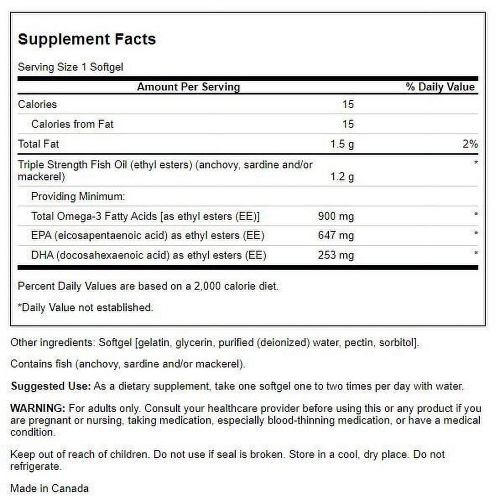 Swanson EFAs Triple Strength Super EPA & DHA delivers an incredible 647 mg of EPA and 253 mg of DHA in ethyl ester form at a fraction of the price you'd pay elsewhere. Featuring high-purity, molecularly distilled oil from wild-caught anchovies, sardines and mackerel enveloped in an innovative enteric-delivery matrix, these softgels bypass the stomach for delivery in the lower GI tract for enhanced absorption, gastric comfort and no fishy burp-back. Triple Strength Super EPA & DHA offers clinical-standard quality and potency at an affordable price. Important Heart-Health Nutrition Most omega-3 research has focused on the two primary fatty acids found in fish oil: eicosapentaenoic acid (EPA) and docosahexaenoic acid (DHA). These omega-3s provide valuable support for healthy cardiovascular function, promoting a favorable lipid balance and helping to maintain blood pressure already within the normal range. In fact, the National Heart Association recommends daily fish oil consumption to