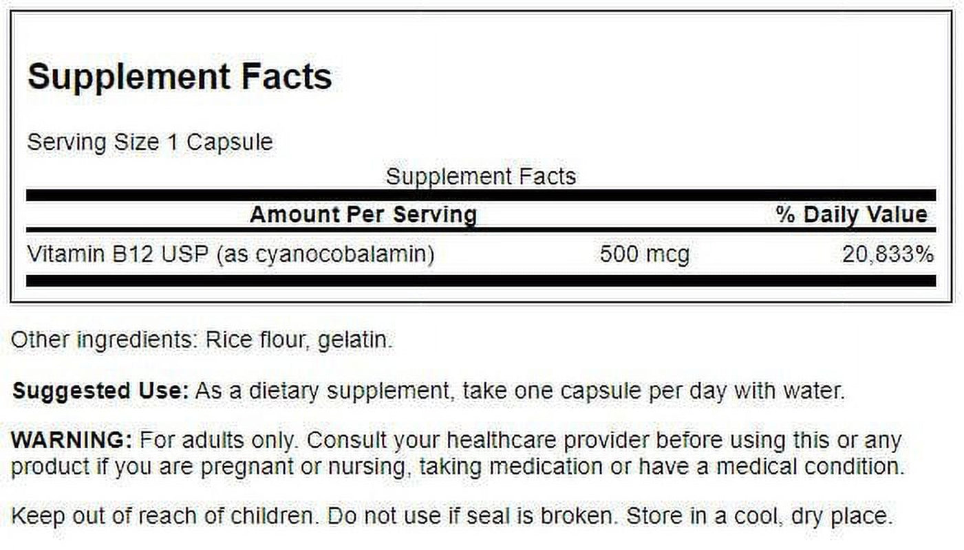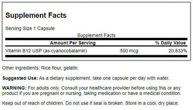 Swanson Vitamin B-12 500 Mcg 100 Capsules - 1 Pack is backordered and will ship as soon as it is back in stock.