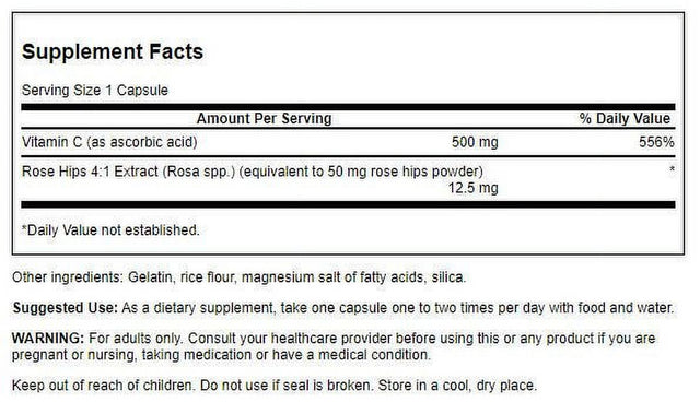 Vitamin C (as ascorbic acid) 500 mg 833%,Rose Hips 4:1 Extract 12.5 mg *,Other ingredients: Gelatin, rice flour, magnesium stearate.,As a dietary supplement, take one capsule one to two times per day with food and water./div>