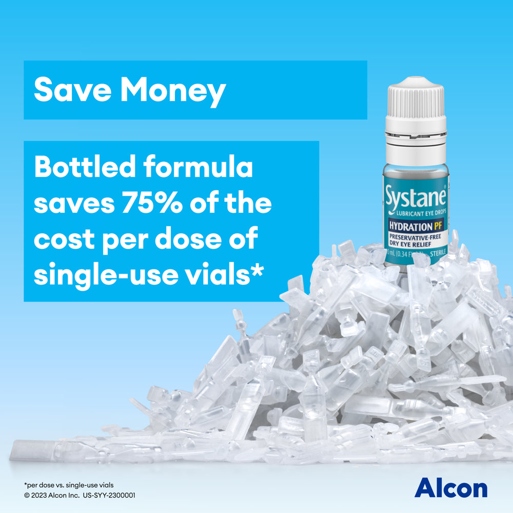 Systane Hydration lubricant eye drops are clinically proven to deliver extended protection and high-performance dry eye symptom relief that lasts. Systane Hydration lubricating eye drops serve as a protectant against further irritation. Find relief from your dry eye symptoms with soothing comfort and added moisture. Shop the entire Systane assortment of eye care products online or in-store at Walmart. Choose Systane, the #1 doctor recommended brand of artificial tears.