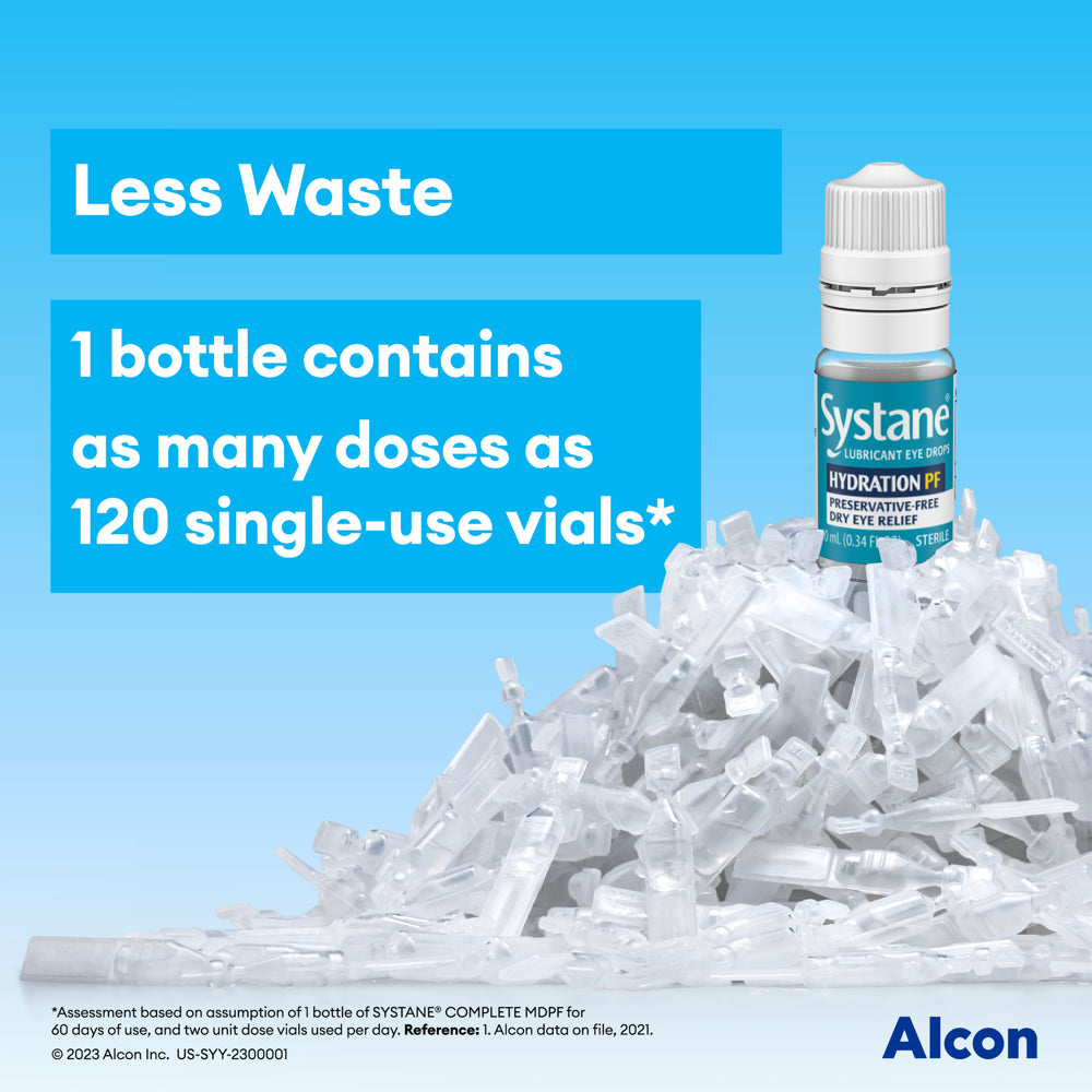 1vs SYSTANE ULTRA Lubricant Eye Drops. 2Assessment based on assumption of 1 bottle of SYSTANE HYDRATION MDPF for 60 days of use, and two unit dose vials used per day. 3vs. SYSTANE HYDRATION UD. *Alcon data on file, 2021.