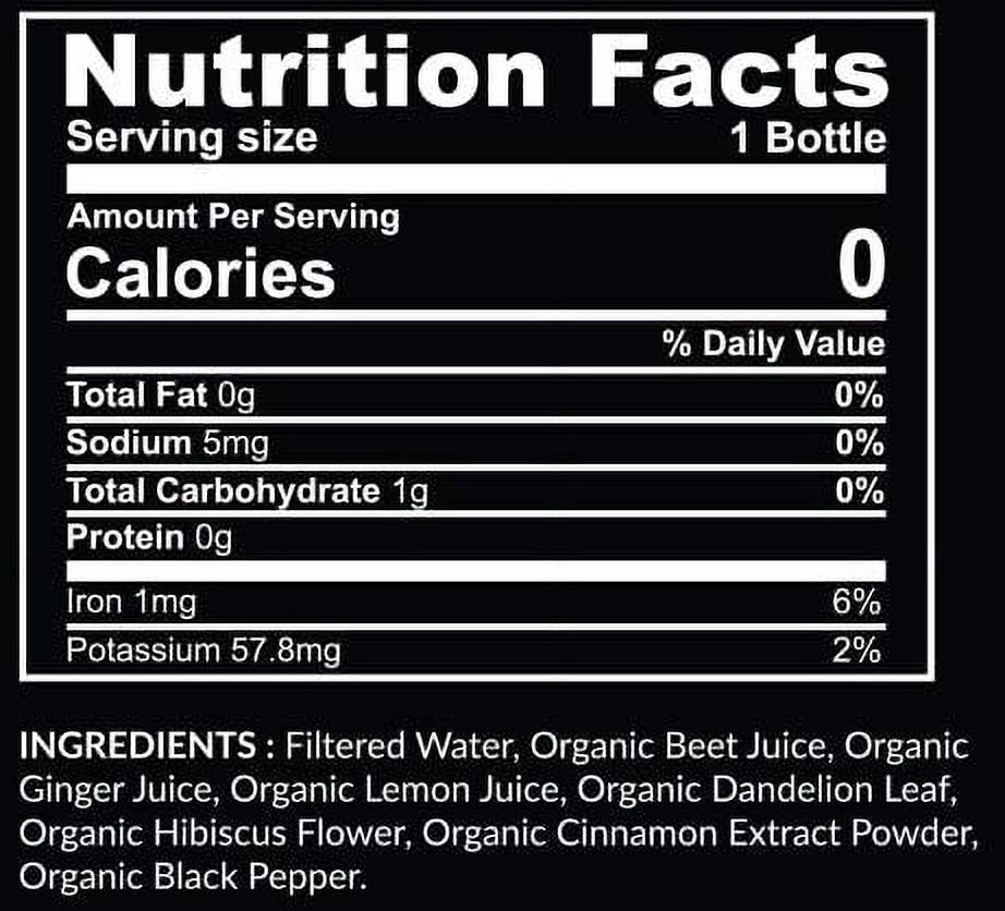 - DETOX: What makes this shot of goodness so effective are its mindfully sourced ingredients - Beet Juice, Lemon Juice, Dandelion Leaf, Hibiscus Flowers, Black Pepper, Cinnamon Extract, Ginger Juice.