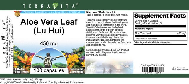 Terravita Aloe Vera Leaf (Lu Hui) - 450 Mg, (100 Capsules, 1-Pack, Zin: 511881) - 1 is backordered and will ship as soon as it is back in stock.