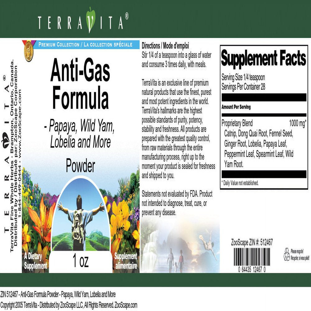 | Product Name | TerraVita Anti-Gas Formula Powder - Papaya, Wild Yam, Lobelia and More, (1 oz, 1-Pack, Zin: 512467) |
