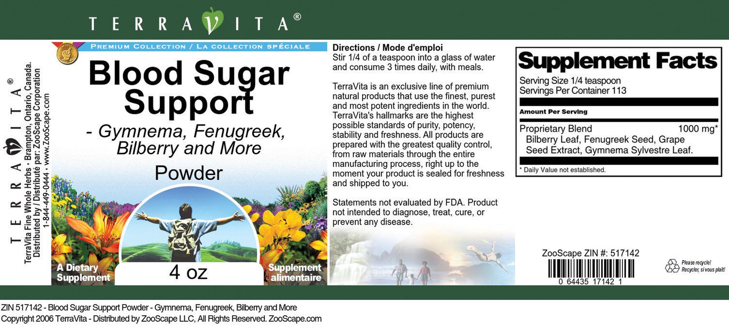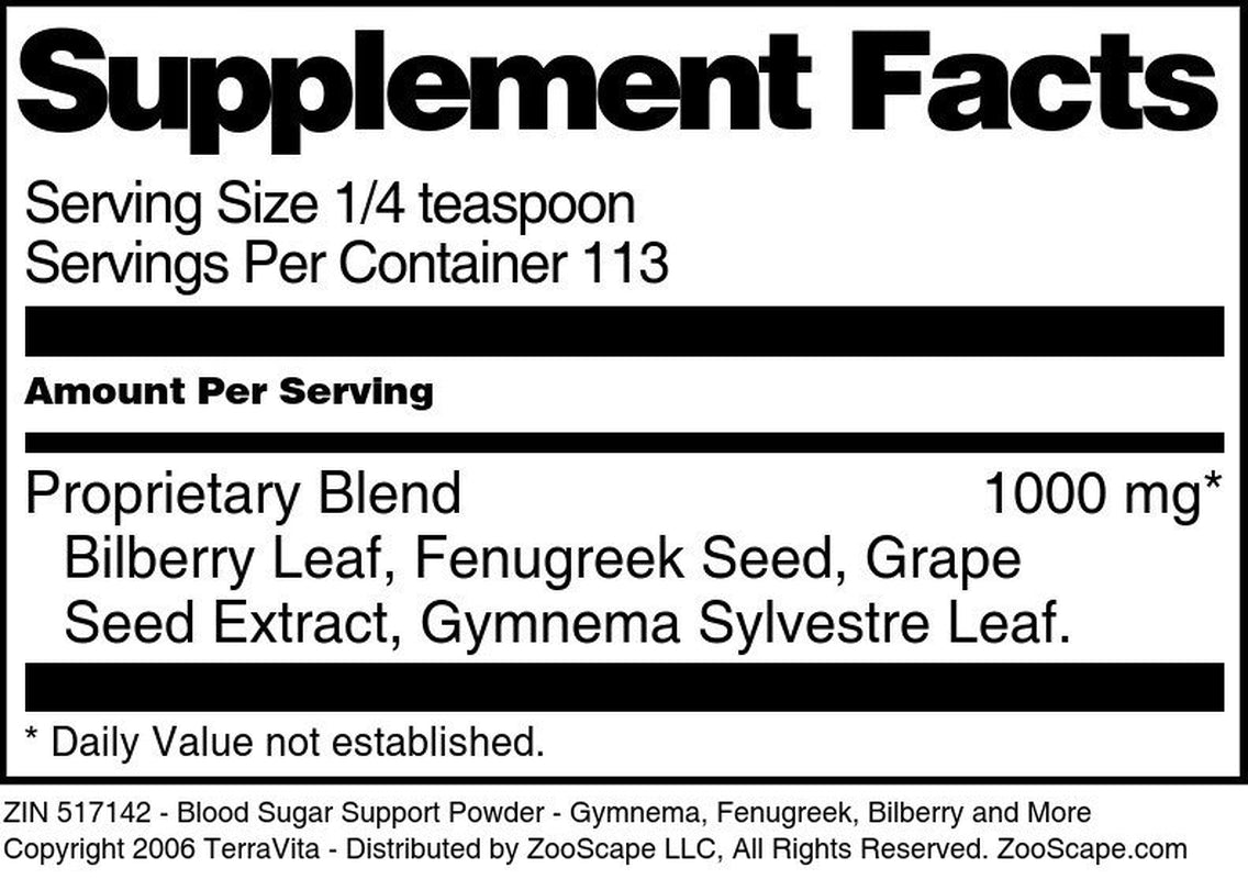 | Product Name | TerraVita Blood Sugar Support Powder - Gymnema, Fenugreek, Bilberry and More, (4 oz, 1-Pack, Zin: 517142) |