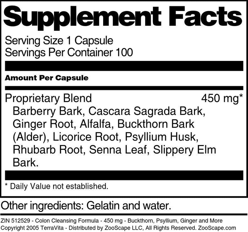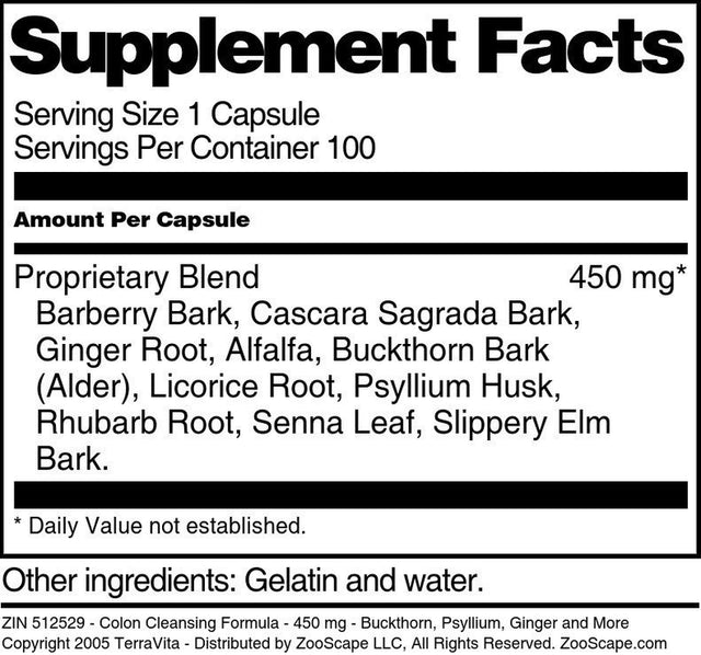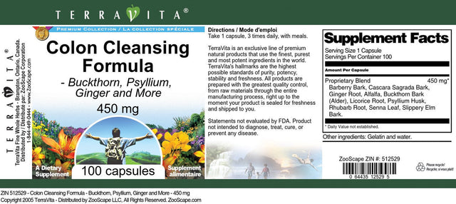 | Product Name | TerraVita Colon Cleansing Formula - Buckthorn, Psyllium, Ginger and More - 450 mg, (100 Capsules, 3-Pack, Zin: 512529) |