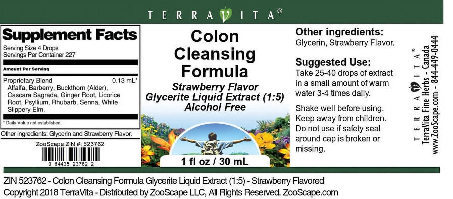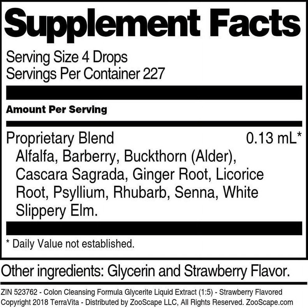 | Product Name | TerraVita Colon Cleansing Formula Glycerite Liquid Extract (1:5) - Strawberry Flavored, (Strawberry, 1 oz, 1-Pack, Zin: 523762) |