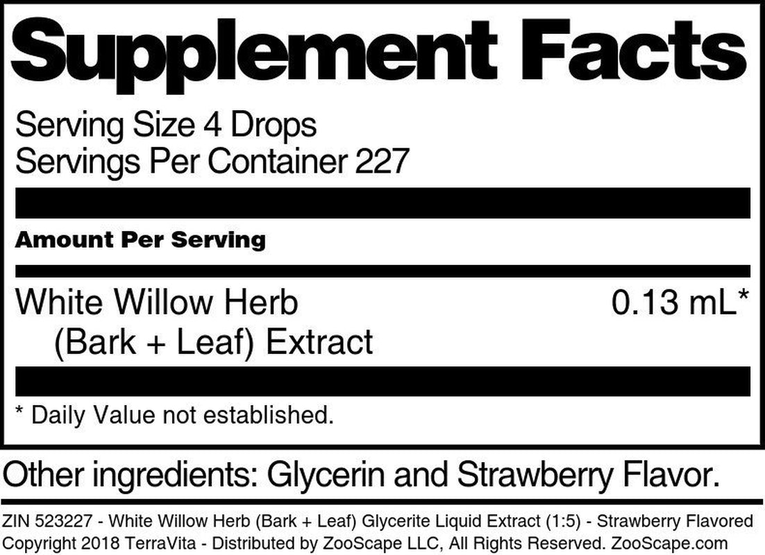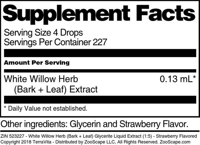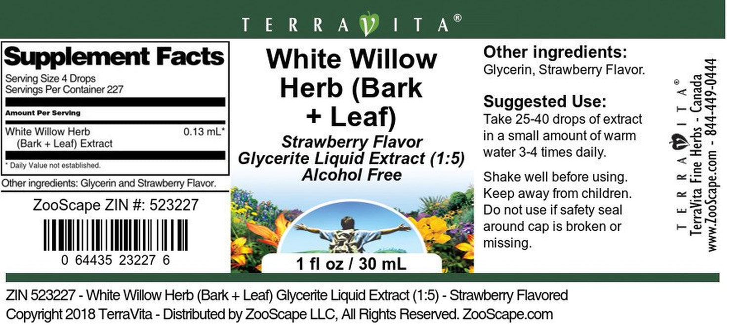 | Product Name | TerraVita White Willow Herb (Bark + Leaf) Glycerite Liquid Extract (1:5) - Strawberry Flavored, (Strawberry, 1 oz, 3-Pack, Zin: 523227) |