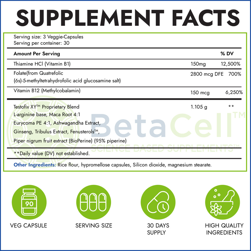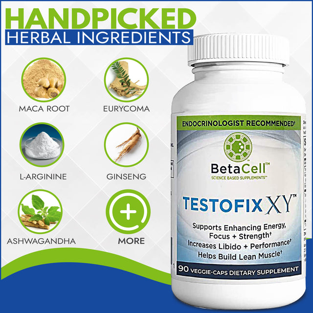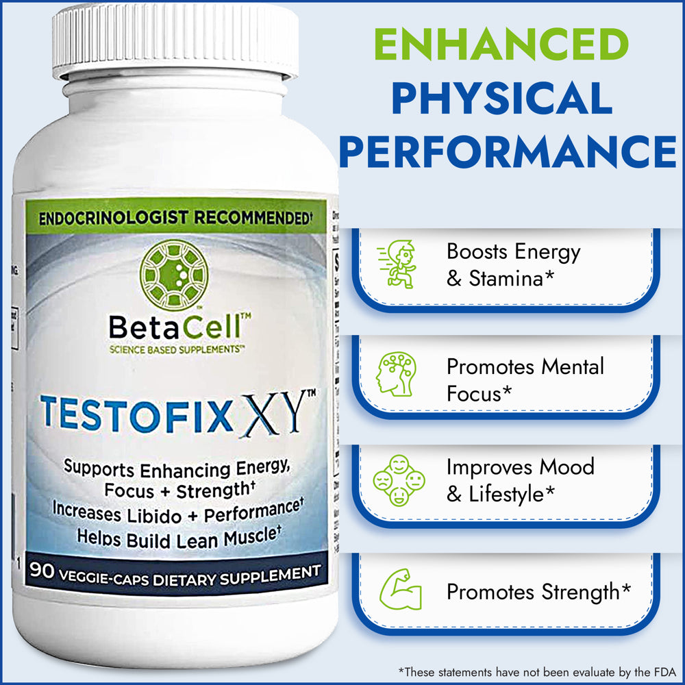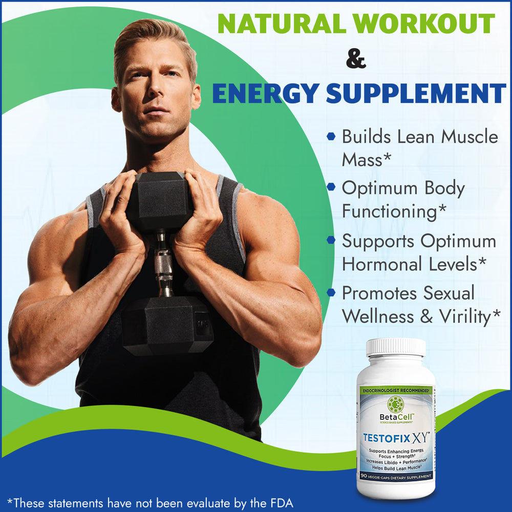 Do you want more muscle, higher energy and stamina? Then you?re in the right place. Testofix XY- Natural Energy supplement is specifically designed to help maintain healthy levels of the hormone to enhance energy, focus, metabolism, and build lean muscle mass. The energy booster works as a natural energy supplement which helps to boost energy, strength, muscle mass, and stamina.Our well-balanced formula is specially designed for men in the 40+ age group, athletes, and bodybuilders. This works as a muscle building supplement for men which helps enhance the quality of life.At Betacell, we believe a healthy life is a happy life and we aim to provide easy access to premium quality vitamins and minerals to help bridge the nutrition gap millions of people experience.Benefits of Natural Workout and Energy Supplement: Endorphin improves heart health which pumps blood in the body and also provides enough oxygen to the muscles and organs needed for peak performance. Increasing your hormone levels can help you gain muscle mass and less fat. Higher of the level of the hormone is important for bone mineral density. Natural energy booster can help improve the quality of life as it boosts energy and increases stamina.Endocrinologist Formulated Endorphin Support veggie capsules Testofix XY may help to improve: Healthy Hormone Levels, Focus Lean Muscle Mass. Each bottle of Testofix XY consists of 90 Veggie capsules. 1 serving = 3 veggie capsules and the bottle lasts for a month if consumed regularly. Safe to Consume: The ingredients are all-natural, free from additives, and GMO and gluten-free.
