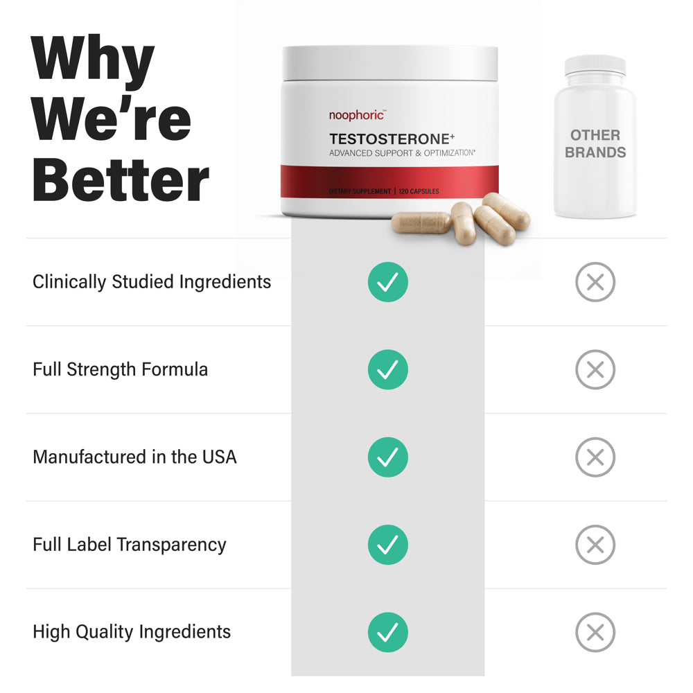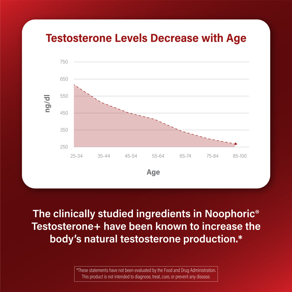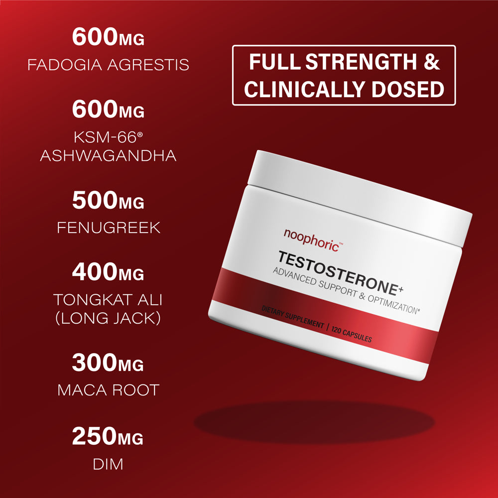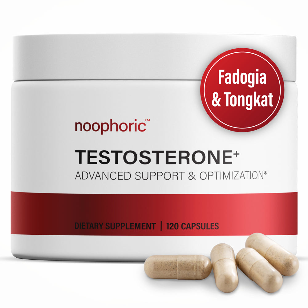 Noophoric Testosterone+ is a natural testosterone supplement for men. Formulated to enhance libido, improve energy levels, build muscle, and promote men's health. Key ingredients like Fadogia Agrestis, Tongkat Ali (LongJack), and Ashwagandha work to support healthy testosterone levels and improve overall well-being. Feel like a new man with all-day energy and increased cognitive function. Noophoric male enhancement testosterone booster and other products are manufactured in the United States in a GMP-certified facility using ingredients sourced from around the world. Take 4 capsules each morning. *These statements have not been evaluated by the Food and Drug Administration. This product is not intended to diagnose, treat, cure or prevent any disease.