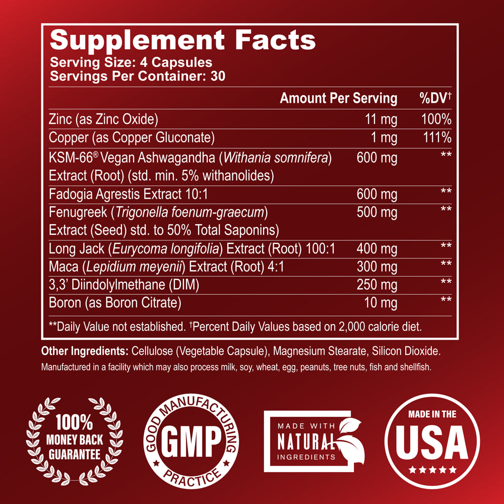 - SCIENCE DRIVEN FORMULATION: Full strength and clinically dosed testosterone booster. The most effective, natural ingredients - Fadogia Agrestis, Tongkat Ali (Long Jack), KSM-66 Ashwagandha, Fenugreek, Maca, DIM, Boron, Zinc, and Copper.