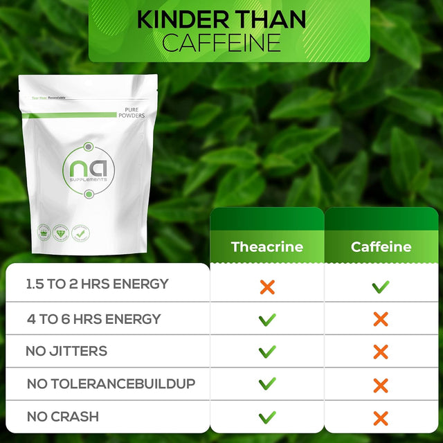 Our theacrine energy supplement is a smarter way to get a natural boost without feeling tense or jittery. With up to six hours’ of natural energy, this energy booster for women and men can help give you the pick me up you need to power through your day while feeling in control. Better still, unlike caffeine pills or caffeine powder, N.A Supplements’ theacrine extract won’t dump you in a sudden crash or require more and more over time to achieve the same effect.