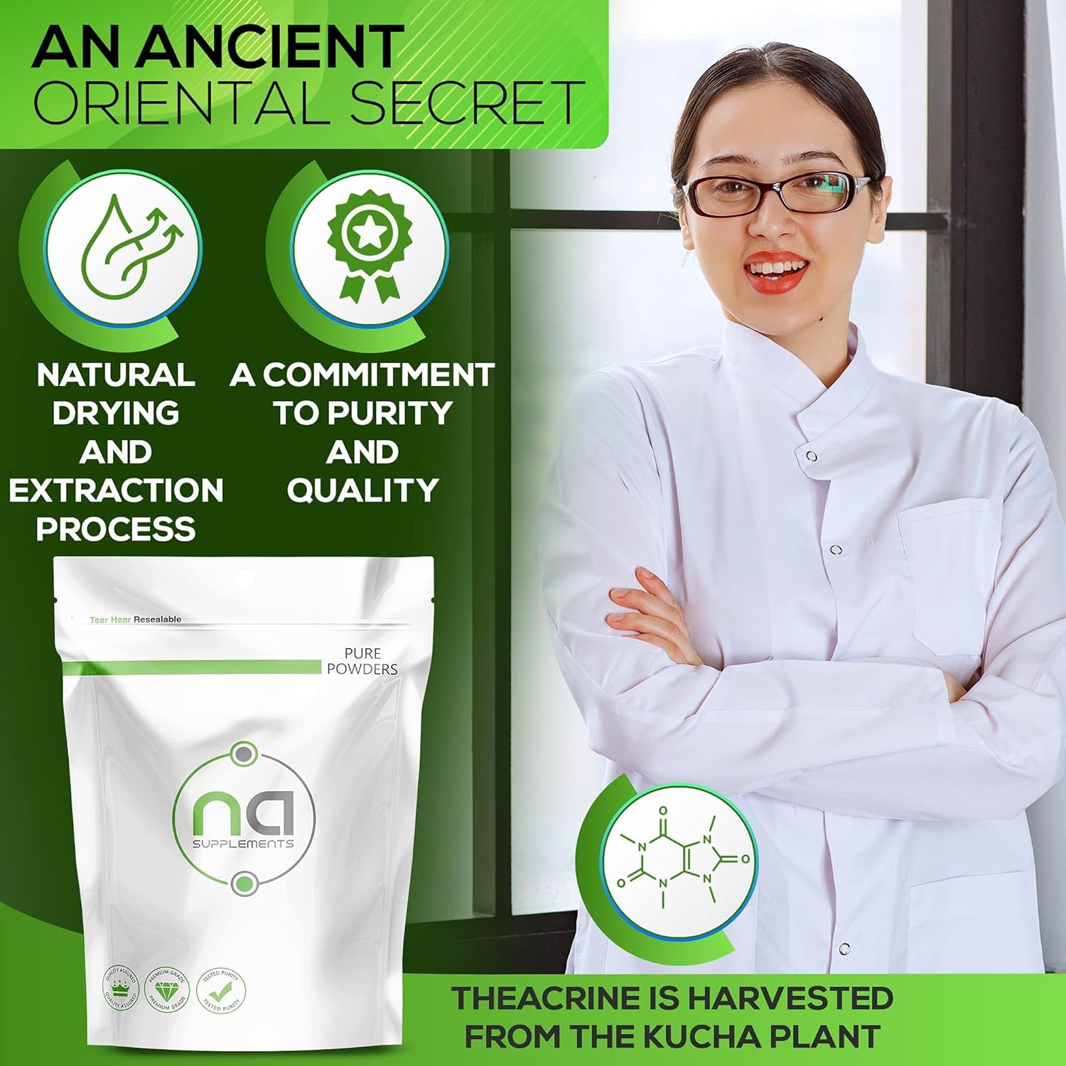 At N.A Supplements, we use an advanced extraction method to ensure that our theacrine powder is 99% pure. Our theacrine energy powder is formulated from kucha leaves, seasonally handpicked for maximum freshness and potency. This ensures that our natural energy extract is of high quality and free from GMOs and other questionable substances.
