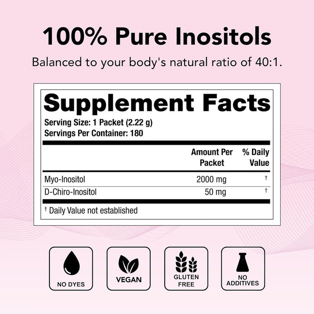 Ovasitol is an evidence-based blend of both myo-inositol and d-chiro inositol, designed to promote optimal hormone levels in support of menstrual cycle regulation, ovarian health, and fertility.* Each dose is individually packaged in single serve packets for convenience and contains 2,000mg of myo-inositol and 50mg of d-chiro inositol. Two packets should be taken per day; a total of 180 packets are included for a 90-day supply. This 40:1 dosing of myo-inositol to d-chiro inositol is the body’s naturally occurring ratio. Clinical studies have shown that inositol supplements support regular menstrual cycles, promotes healthy insulin levels, and supports ovarian health.* Ovasitol has been used in multiple university-based clinical trials. Ovasitol contains 100% pure inositol and no additives. Dye-free, gluten-free, and vegan. Mix one packet into any hot or cold beverage and consume with a meal. Take two servings per day (2 packets). Made in the USA in a cGMP compliant facility. Independently tested and certified by NSF International for content accuracy, quality, and freedom of contaminants. *These statements have not been evaluated by the Food and Drug Administration. This product is not intended to diagnose, treat, cure, or prevent any disease.