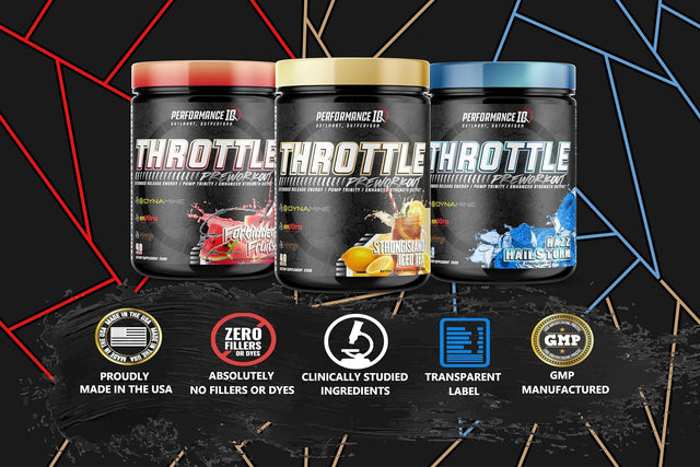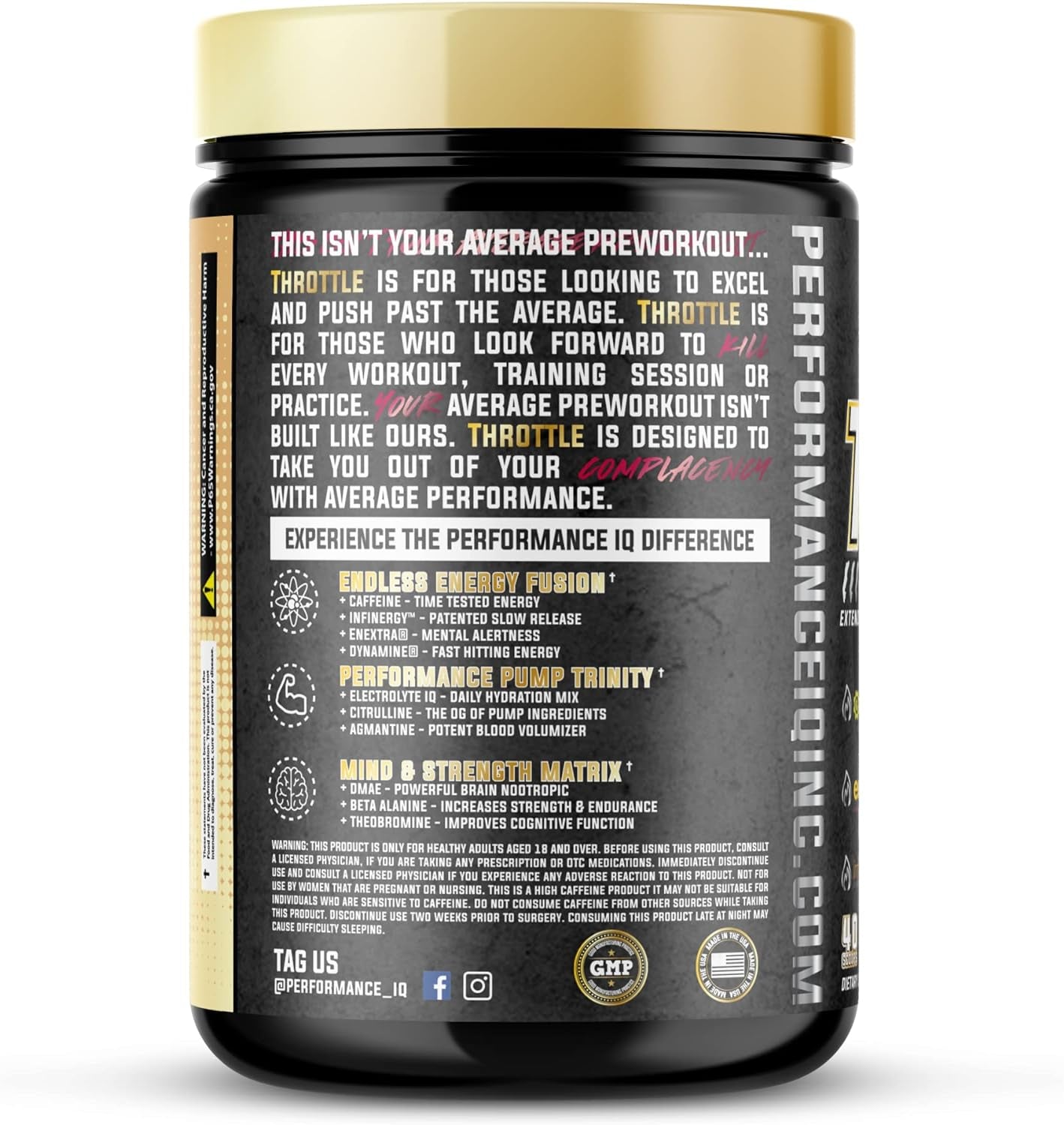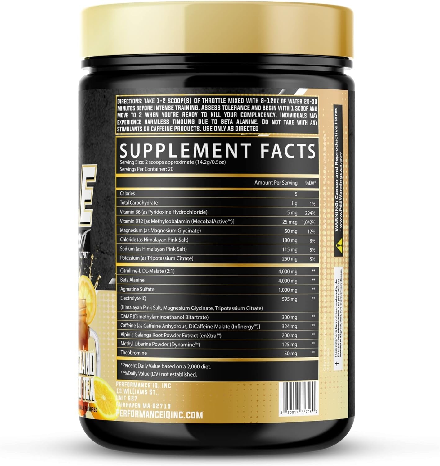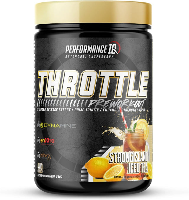 Throttle Pre Workout - Endless Energy - Extreme Focus - Long Lasting Pumps · Strength & Endurance · Dynamine® · Infinergy™ · Enxtra® ·Citrulline · Beta Alanine · DMAE · Caffeine Strong Island Iced Tea