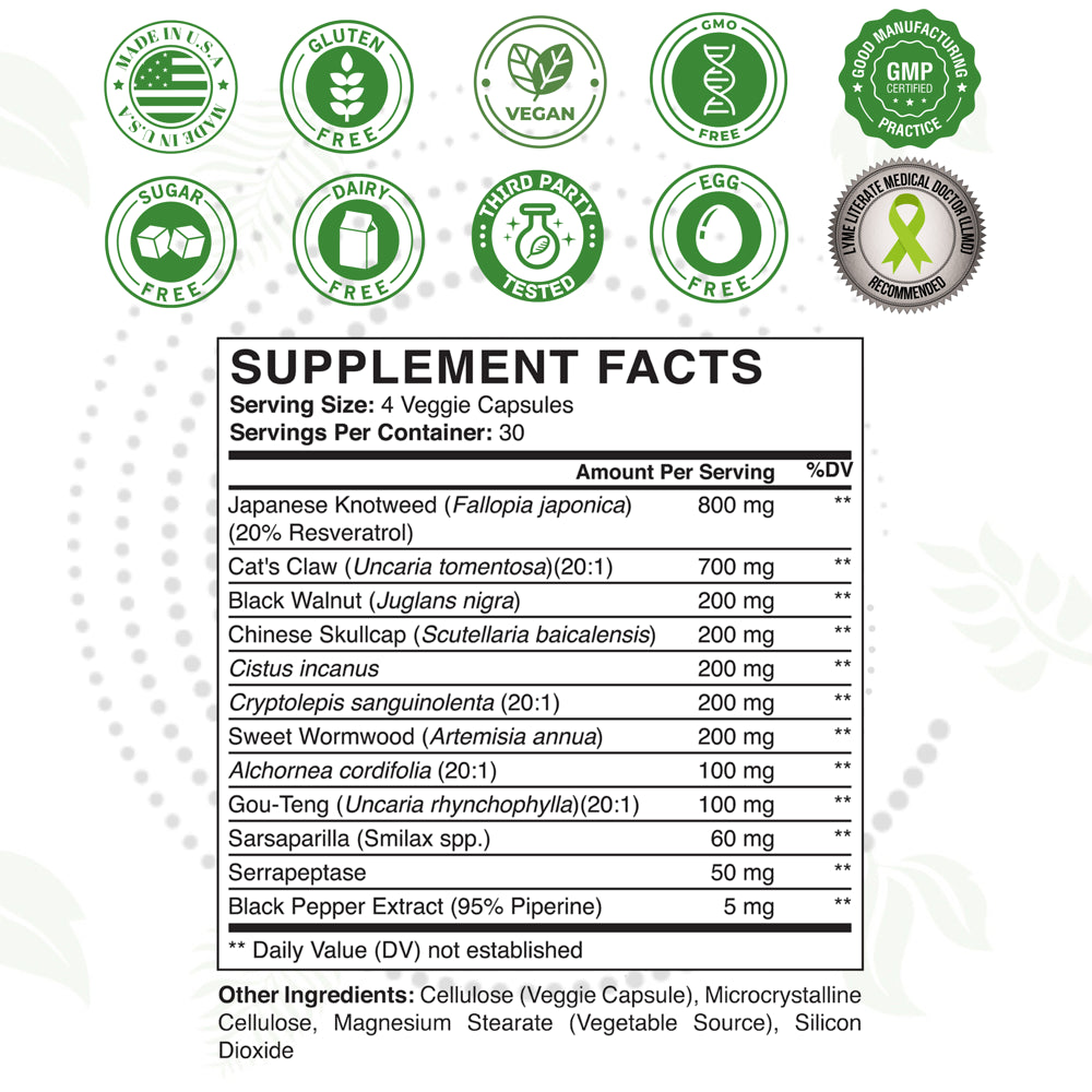| Product Name | Tick Bite Immune Support Supplement - Japanese Knotweed, Cat's Claw, Chinese Skullcap, Cryptolepis Sanguinolenta, Black Walnut, Black Pepper Extract, Sweet Wormwood Capsules - 120 Vegan Capsules |