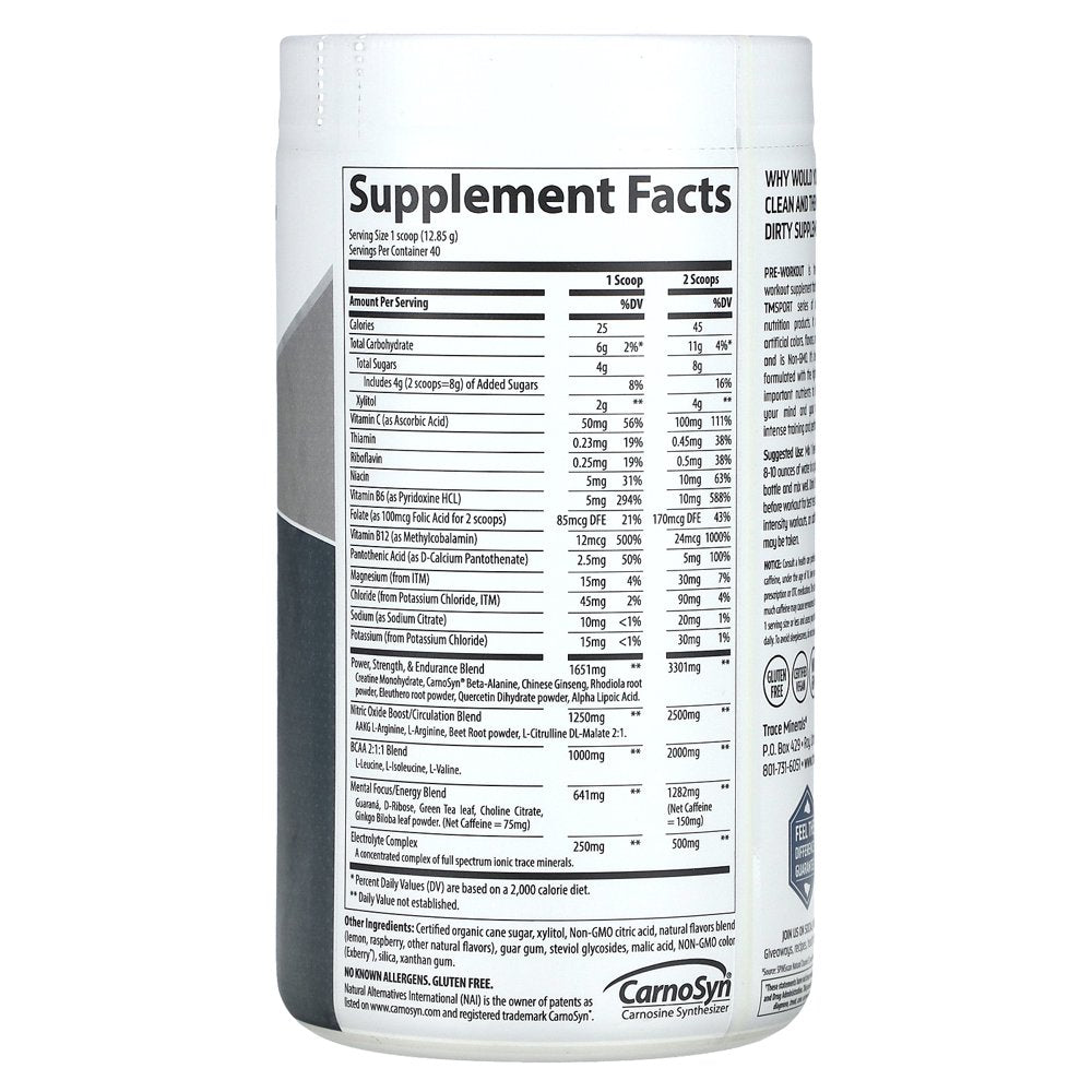 Trace Minerals Research - TMR FIt Series Clean Pre Workout Powder Raspberry Lemonade - 18.1 oz. (1.1 lb. / 514 g) Supplement Facts Serving Size 1 scoop (12.9g) Servings Per Container About 40 1 Scoop 2 Scoops Amount Per Serving %DV %DV Calories 25 45 Total Carbohydrate 5 g 2%* 11 g 4%* Sugars 4 g 8 g Vitamin C (as Ascorbic Acid) 50 mg 83% 100 mg 166% Thiamin 0.23 mg 15% 0.45 mg 30% Riboflavin 0.25 mg 15% 0.5 mg 30% Niacin 5 mg 25% 10 mg 50% Vitamin B6 (as PyridoxineHCl) 5 mg 250% 10 mg 500% Folic Acid 50 mcg 13% 100 mcg 25% Vitamin B12 (as Methylcobalamin) 12 mcg 200% 24 mcg 400% Pantothenic Acid (as D-Calcium Pantothenate) 2.5 mg 25% 5 mg 50% Magnesium (from ITM) 15 mg 4% 30 mg 8% Chloride (from PotassiumChloride, ITM) 45 mg 2% 90 mg 4% Sodium (as Sodium Citrate) 10 mg <1% 20 mg 1% Potassium (from Potassium Chloride) 15 mg <1% 30 mg <1% Power, Strength, &Endurance Blend 1651 mg † 3301 mg † Creatine Monohydrate, CarnoSyn Beta-Alanine, Creatine HCl, Chinese Ginseng, Rhodiola root powder, Eleuthero root powder, Quercetin Dihydrate powder, Alpha Lipoic Acid. Nitric Oxide Boost/Circulation Blend 1250 mg † 2500 mg † AAKG L-Arginine, L-Arginine, Beet Root powder, L-Citrulline DL-Malate 2:1. BCAA 2:1:1 Blend 1000 mg † 2000 mg † L-Leucine, L-Isoleucine, L-Valine. Mental Focus/Energy Blend 641 mg † 1282 mg † Guarana, D-Ribose, Green Tea leaf, Choline Citrate, Ginkgo Biloba leaf powder.(Net Caffeine=75mg) (Net Caffeine= 150mg) Ionic Trace Minerals (ITM) Electrolyte Blend 250 mg † 500 mg † A complex of over 72 naturally occurring ionic trace minerals and electrolytes. * Percent Daily Values (DV) are based on a 2,000 calorie diet.† Daily Value not established. Other Ingredients: Certified organic cane sugar, xylitol, citric acid, natural flavo0rs blend (lemon, raspberry, other natural flavors), guar gum, stevia leaf extract, malic acid, natural Non-GMO color (Exberry), silica, xanthan gum.Allergen Info: contains no known allergens. Gluten Free/div>