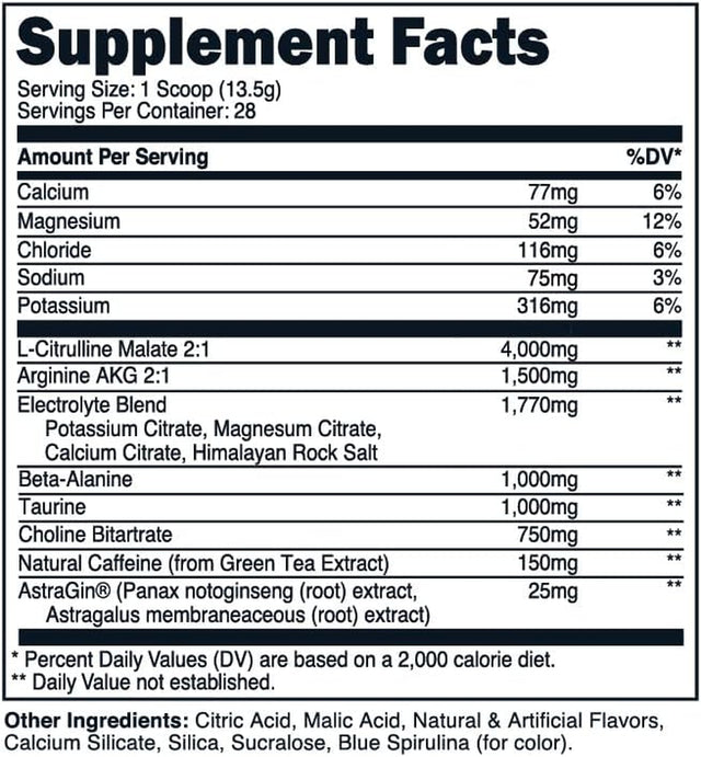 TransformHQ pre-workout supplement contains 28 servings per bottle, with 150mg of natural caffeine. This pre-workout is designed to support your workout and includes an electrolyte blend with ingredients such as Di-Potassium Phosphate and Himalayan Rock Salt.
