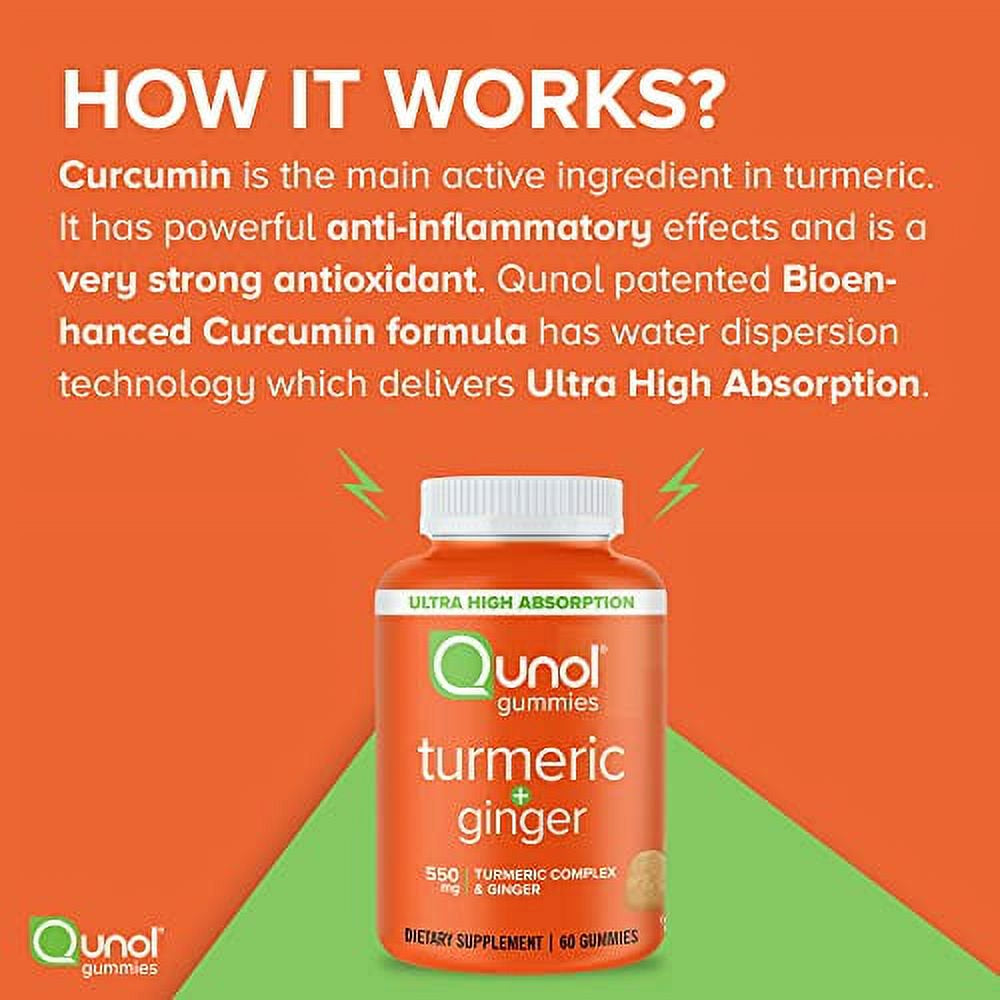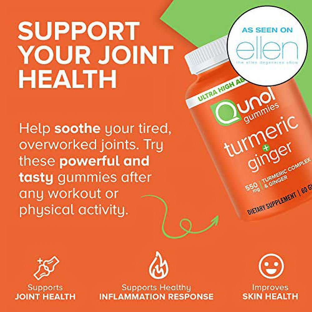 Turmeric and Ginger Gummies, Qunol Gummy with 500Mg Turmeric + 50Mg Ginger, Joint Support Supplement, Vegan, Gluten Free, Ultra High Absorption (60 Count, Pack of 1), Packaging May Vary